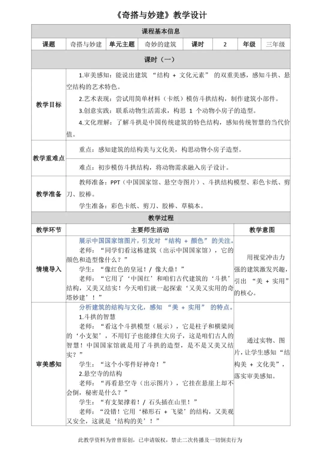 3.奇搭与妙建 | 欣赏评述经典建筑,说一说它们的艺术特色。体验搭建的奥秘。 | 2 |