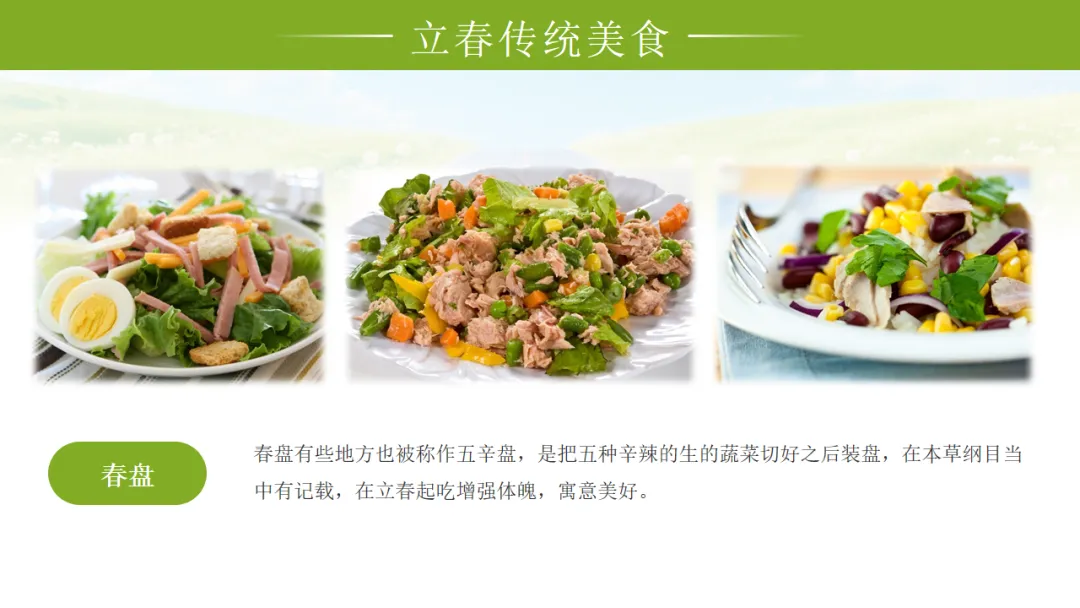 春盘有些地方也被称作五辛盘,是把五种辛辣的生的蔬菜切好之后装盘,在本草纲目当中有记载,在立春起吃增强体魄,寓意美好。