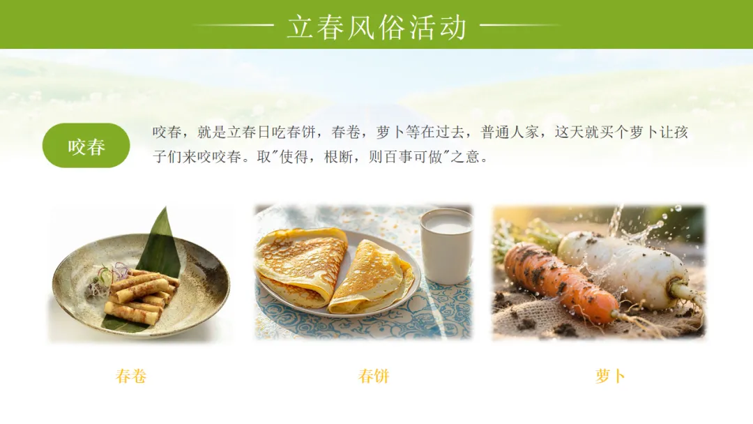咬春,就是立春日吃春饼,春卷,萝卜等在过去,普通人家,这天就买个萝卜让孩子们来咬咬春。取"使得,根断,则百事可做"之意。