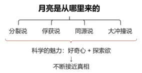 难点:理解四种假说之间的继承与批判关系,尤其是“大冲撞说”与“分裂说”的本质区别,辩证分析每种假说的合理性与不足,避免单一化、绝对化判断。