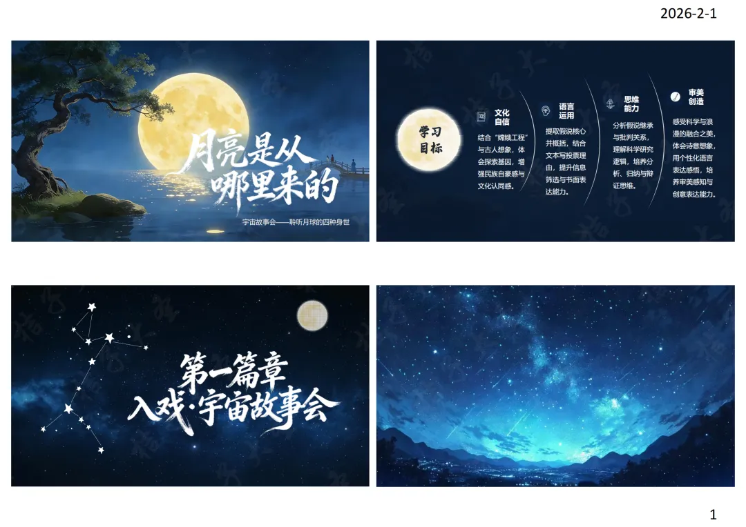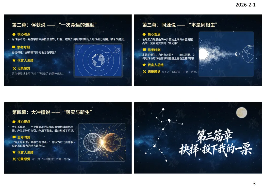 教师语言:同学们,此刻我们仿佛置身宇宙深处。抬头仰望,月亮总是以温柔的姿态陪伴着地球,它像一个神秘的谜语,困扰了人类千万年。今天,我们就一起解锁这个谜语——月亮到底从何而来?