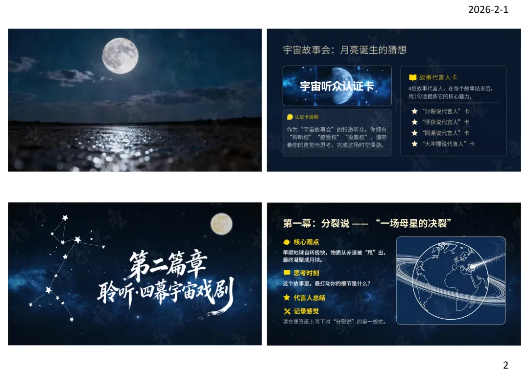 教师语言:在聆听每个故事时,大家要完成两个小任务:一是在第一张便签纸上,用1个词或1句话,写下对这个故事的“第一感觉”;二是认真倾听代言人的总结,跟着老师的引导,捕捉故事里的科学逻辑与浪漫细节。现在,让我们有请第一位“宇宙说书人”,带来第一个月亮诞生的故事——“分裂说”。