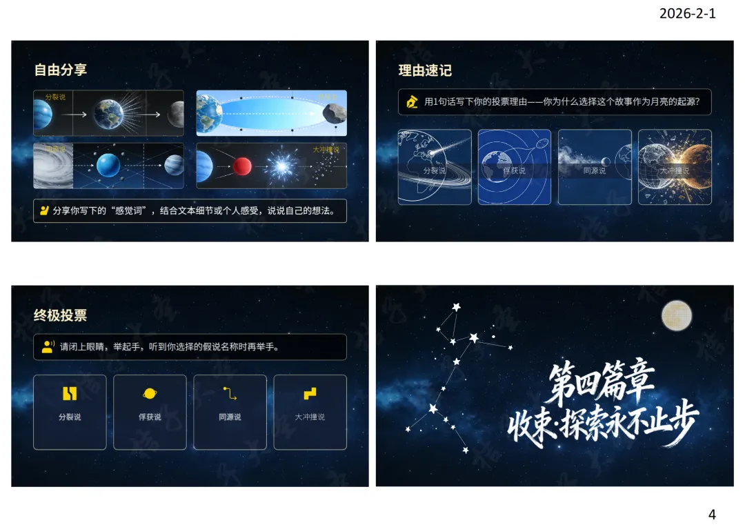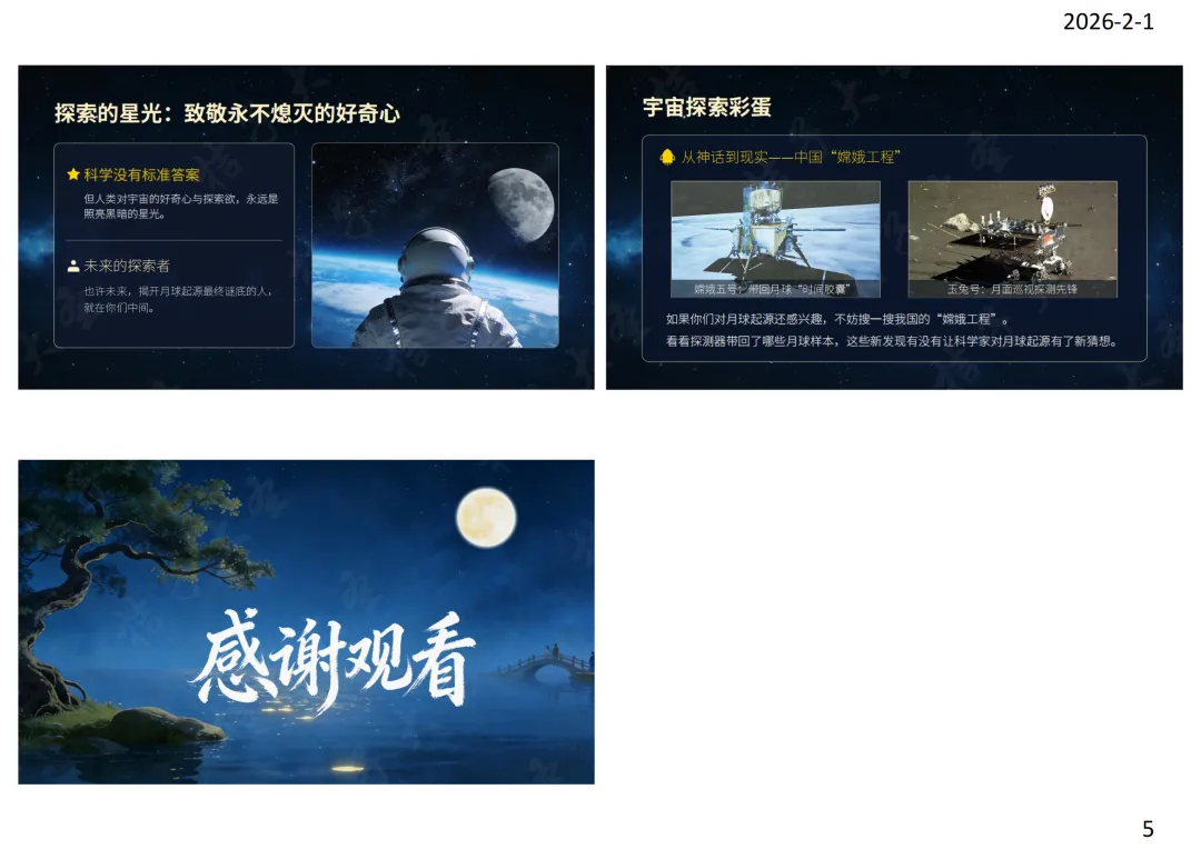 教师语言:最后给大家留一个“宇宙探索彩蛋”:课后如果你们对月球起源还感兴趣,不妨搜一搜我国的“嫦娥工程”——看看探测器带回了哪些月球样本,这些新发现有没有让科学家对月球起源有了新猜想。现在,让我们带着这份好奇,结束今天的“宇宙故事会”。