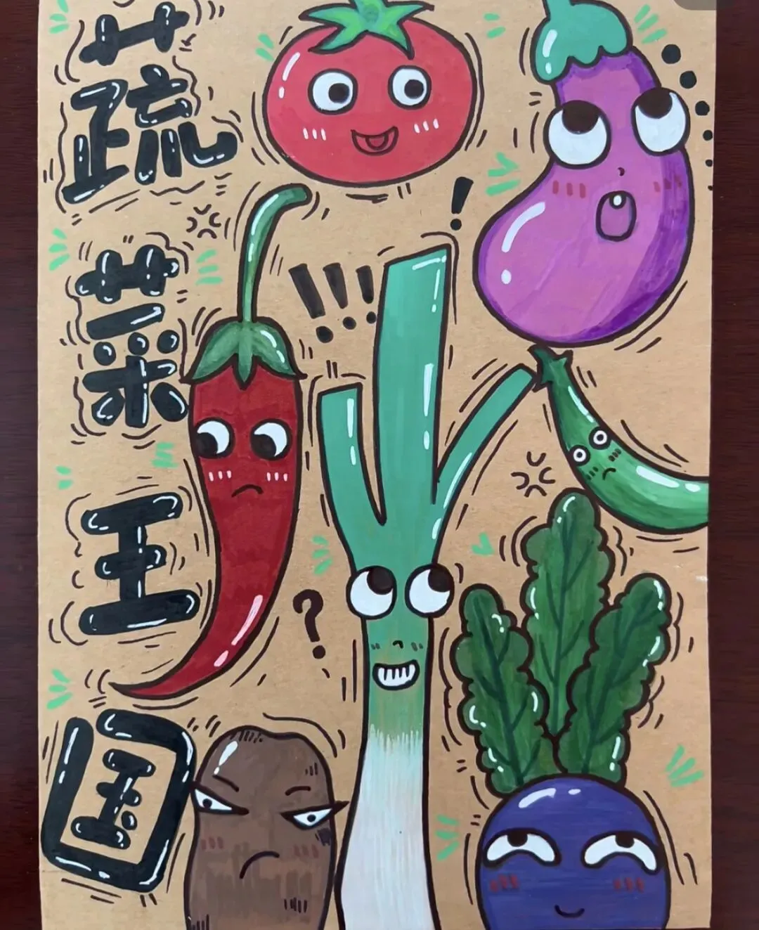 - 引导学生为自己的作品起名字(如《胡萝卜国王的生日派对》《西兰花森林大冒险》《蔬菜王国的彩虹桥》),写在画面角落