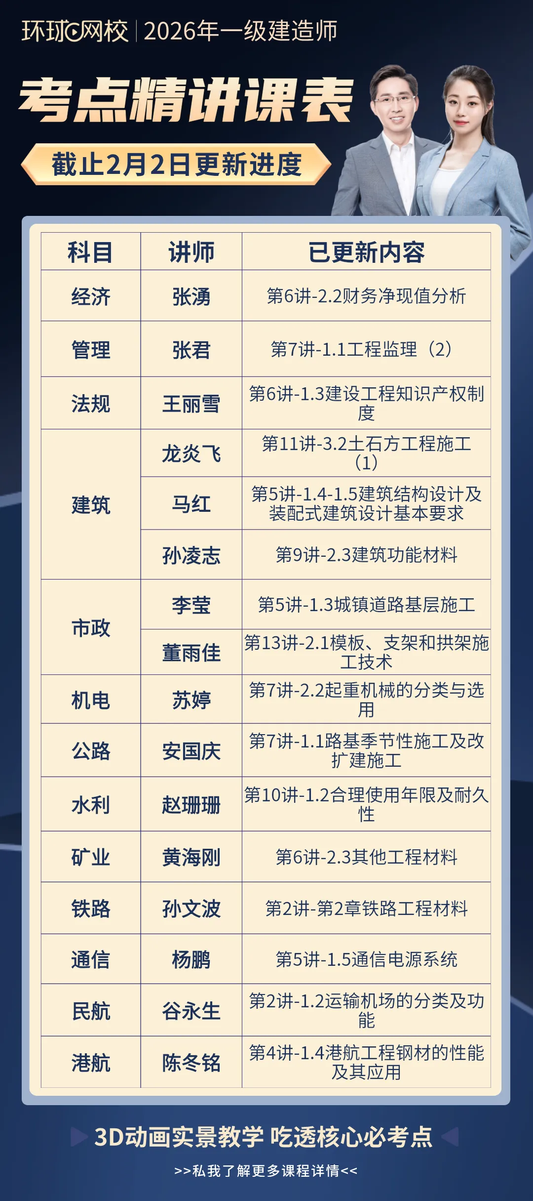 今天统一回复大家:2026一建考点精讲班,已经更新啦。如果你对着上千页的新教材无从下手,总觉得效率太低,那今天这篇文章就是为你准备的。