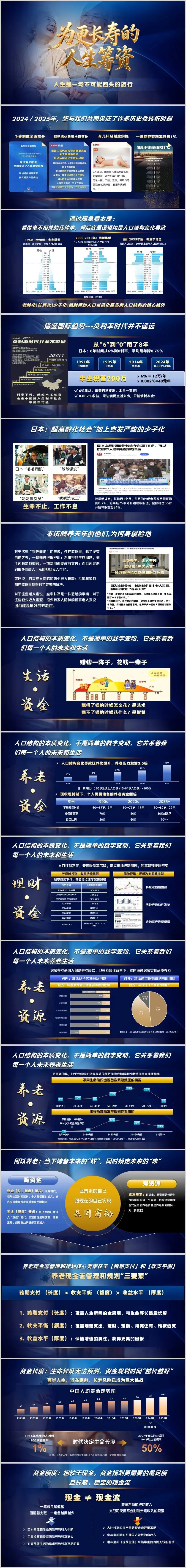 养老现金流管理和规划的核心要素在于“跨期支付”和“收支平衡”。跨期支付的“长度”要覆盖人生全周期,与生命等长是最优解;收支平衡的“额度”要覆盖刚需支出,定时、定额、用完还有、难被透支;收益水平的“厚度”则要具备保值增值的属性,以获得更高回报。在这三要素中,跨期支付的“长度”最为关键,因为生命长度无法预测,资金规划时间“越长越好”。百岁人生已近在眼前,长寿风险成为巨大挑战。中国人均寿命走势图显示,时代决定生命长度,1914年出生的人活到100岁的概率仅为1%,而2007年出生的人活到104岁以上的概率高达50%。