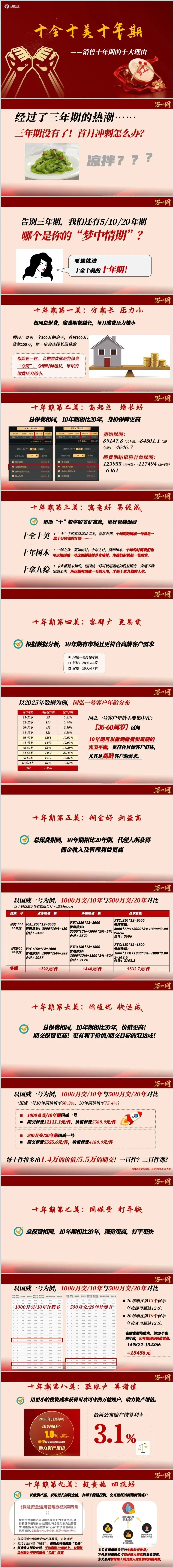 销售话术范例:“王总,中国人讲究‘十全十美’,‘十’这个数字代表着圆满、完美。选择十年期的国威一号,正是契合了这种美好的寓意。我们用十年时间,像培育树木一样培育这份保障——前三年扎根,中间四年生长,最后三年开花结果。十年之后,您将收获的不仅是一份保险,更是一棵为您家庭遮风挡雨的财富大树,真正实现‘十全十美’的财务规划。”