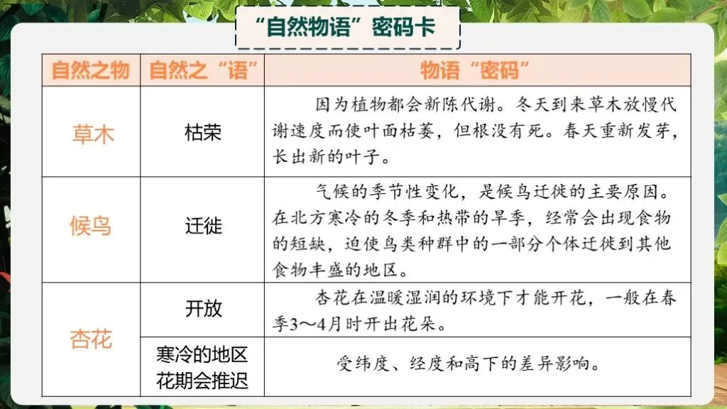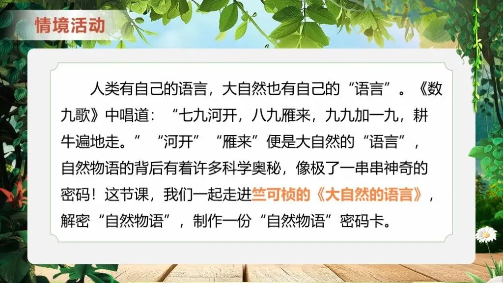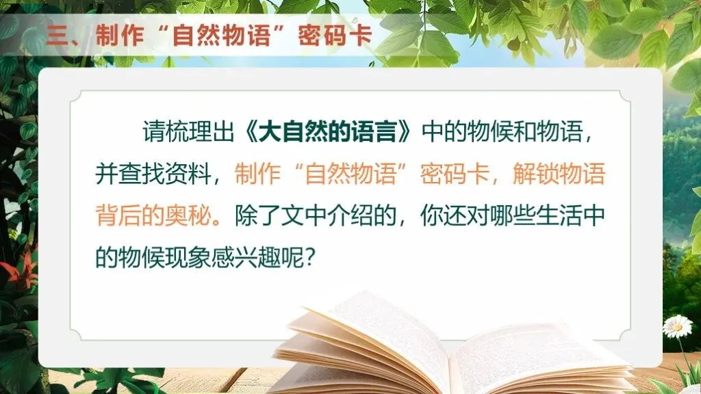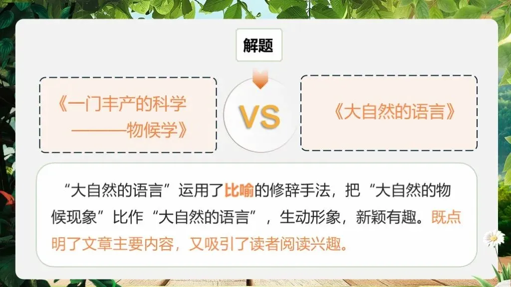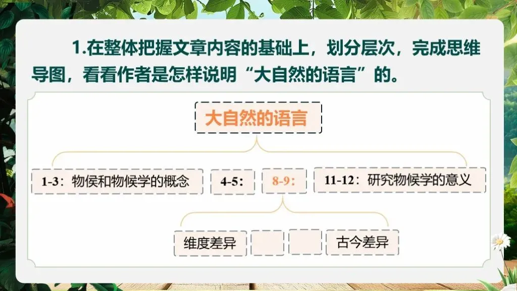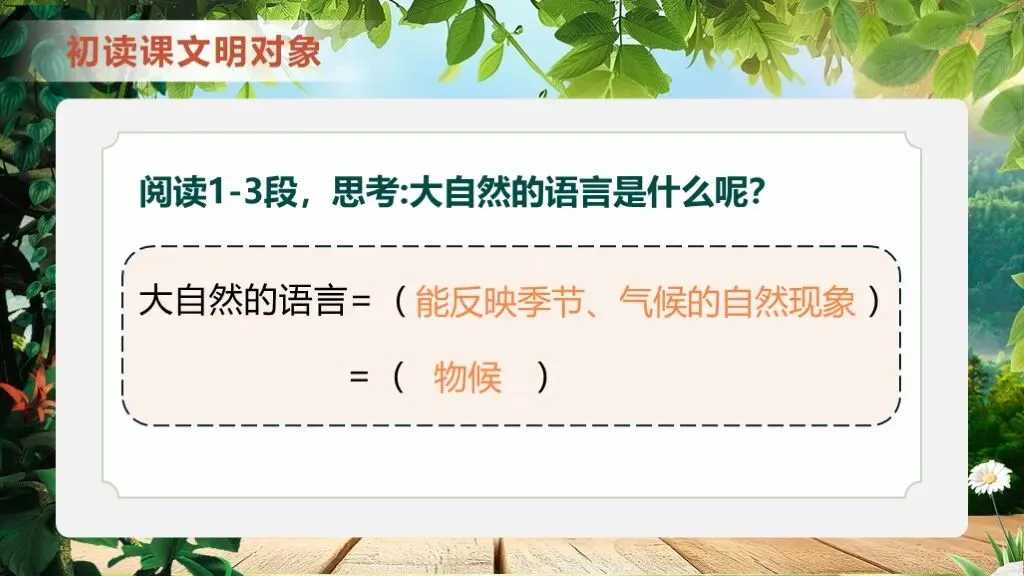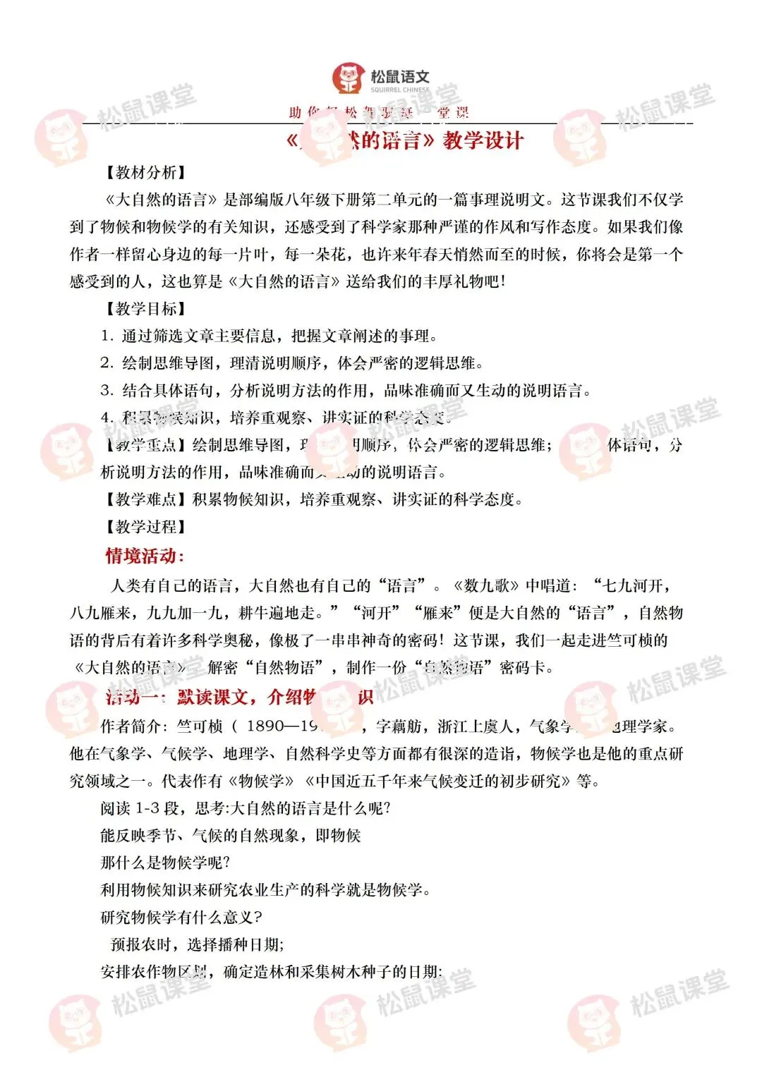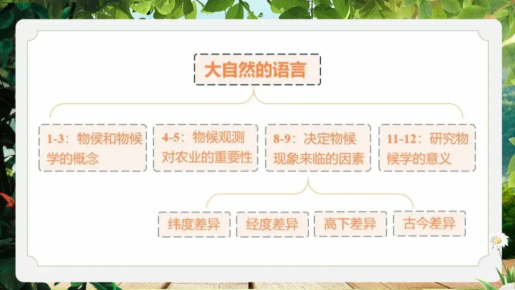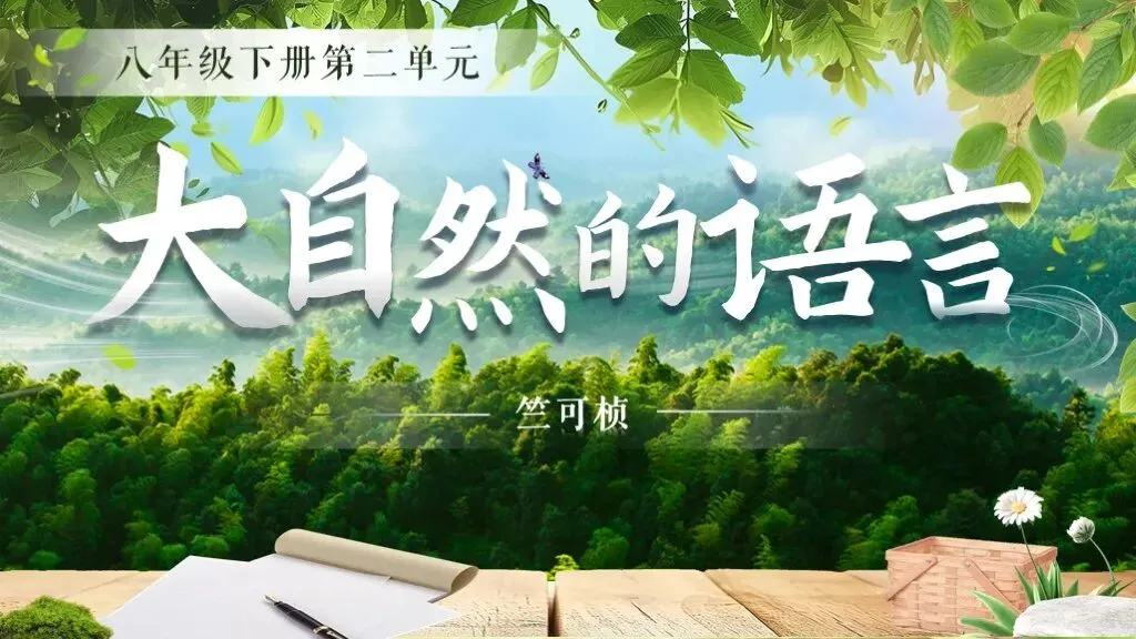 《大自然的语言》是部编版八年级下册第二单元的一篇事理说明文。这节课我们不仅学到了物候和物候学的有关知识,还感受到了科学家那种严谨的作风和写作态度。如果我们像作者一样留心身边的每一片叶,每一朵花,也许来年春天悄然而至的时候,你将会是第一个感受到的人,这也算是《大自然的语言》送给我们的丰厚礼物吧!