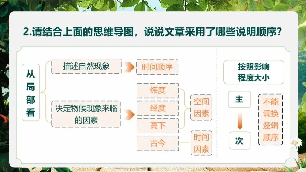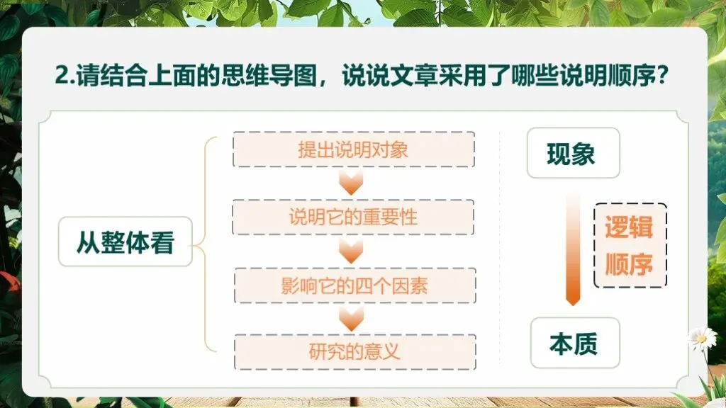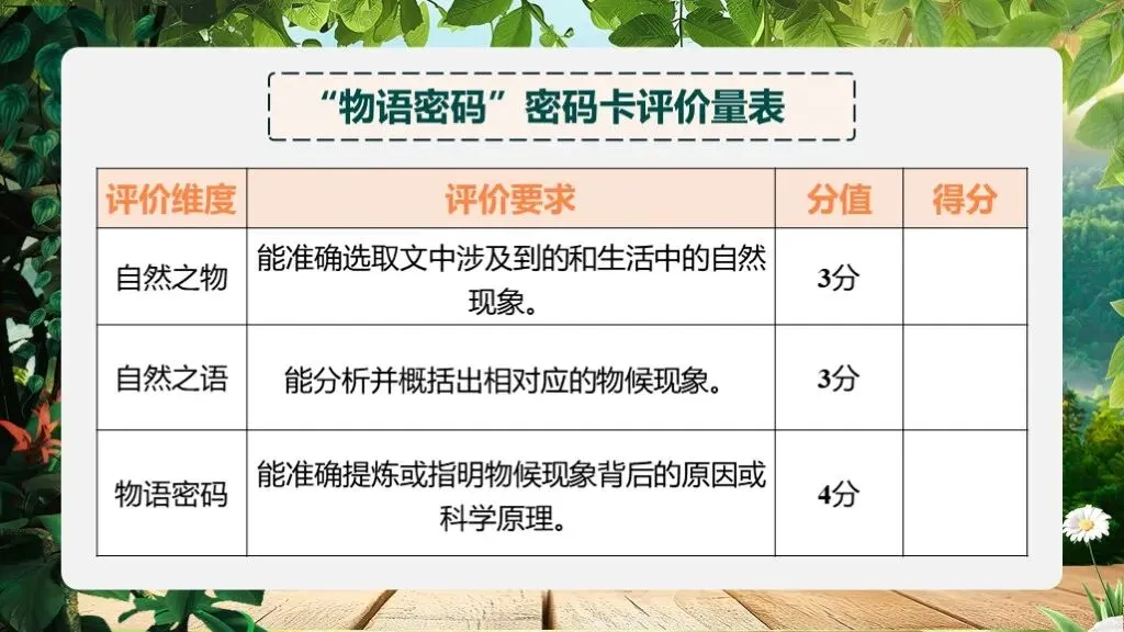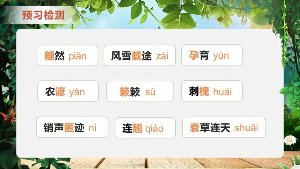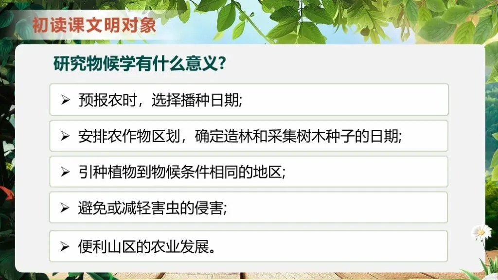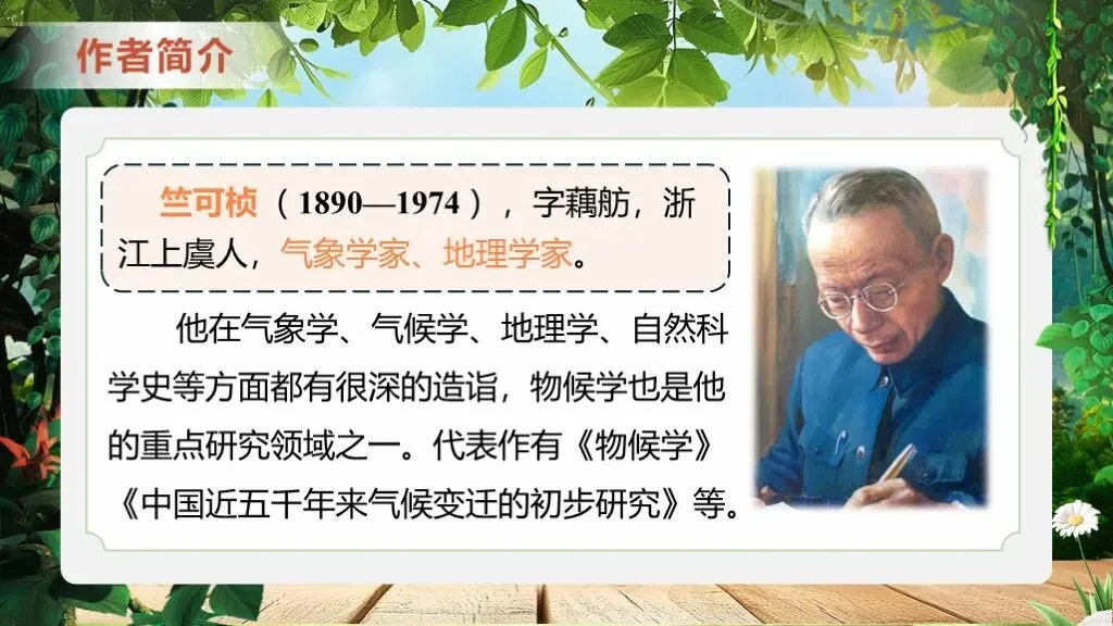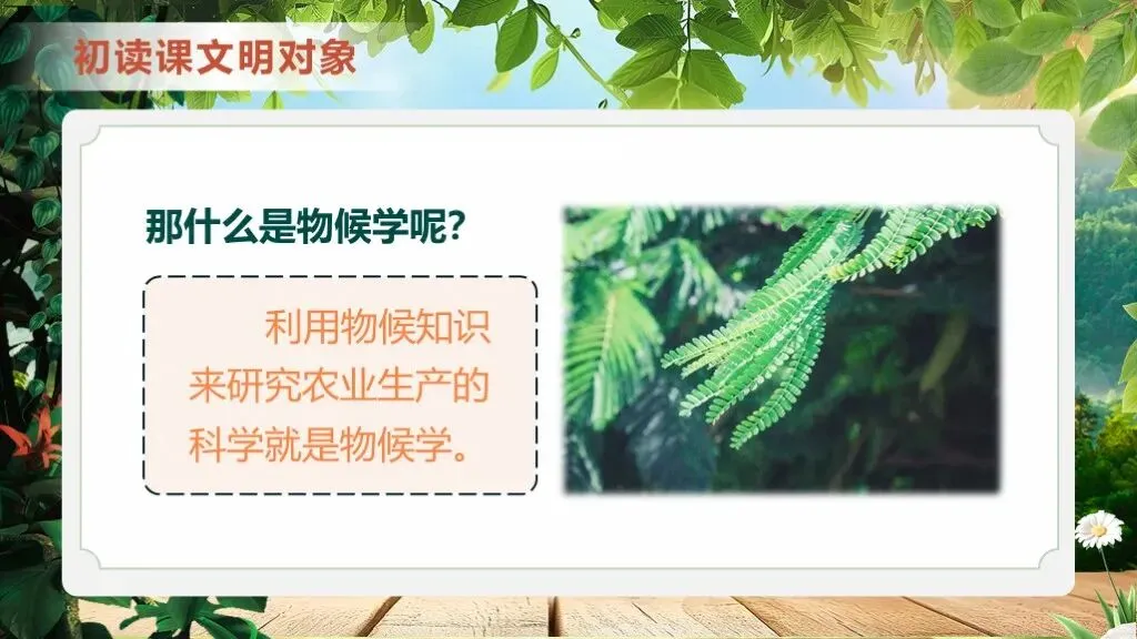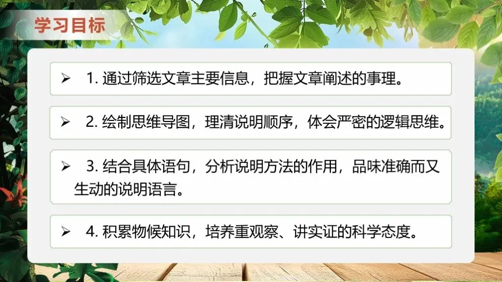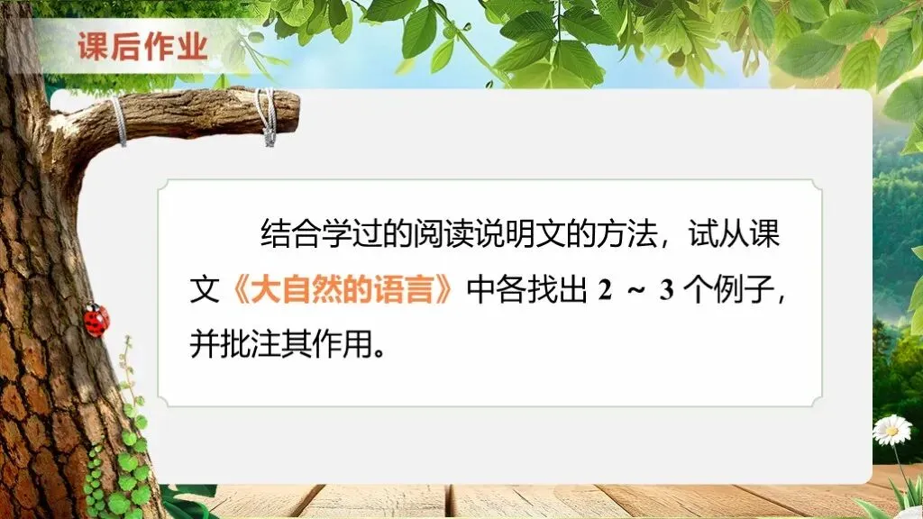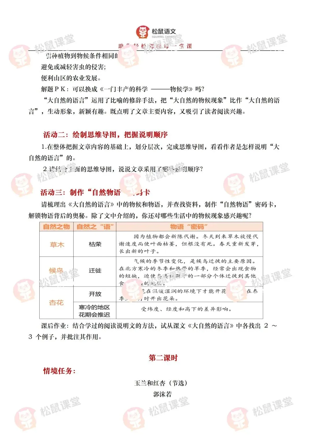 《大自然的语言》是部编版八年级下册第二单元的一篇事理说明文。这节课我们不仅学到了物候和物候学的有关知识,还感受到了科学家那种严谨的作风和写作态度。如果我们像作者一样留心身边的每一片叶,每一朵花,也许来年春天悄然而至的时候,你将会是第一个感受到的人,这也算是《大自然的语言》送给我们的丰厚礼物吧!