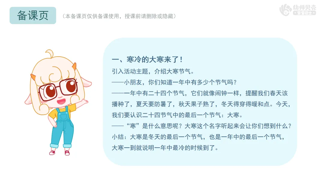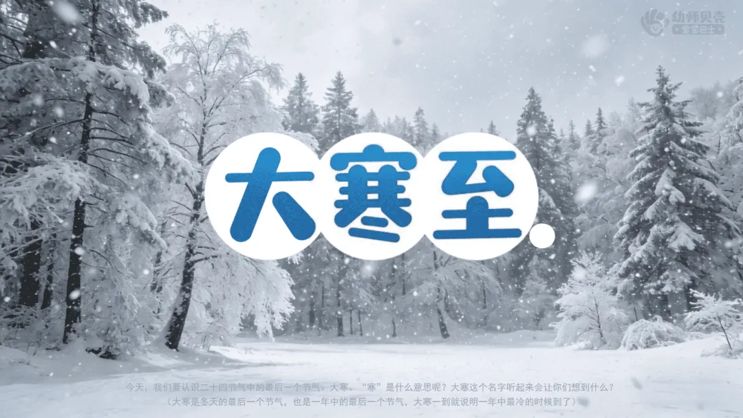 ——一年中有二十四个节气,它们就像闹钟一样,提醒我们春天该播种了,夏天要防暑了,秋天果子熟了,冬天得穿得暖和点。今天,我们要认识二十四节气中的最后一个节气:大寒。