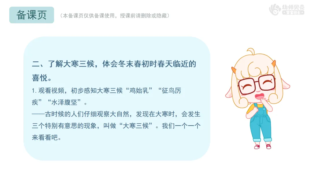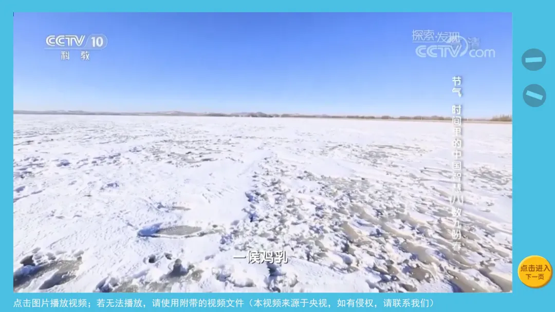 1.观看视频,初步感知大寒三候“鸡始乳”“征鸟厉疾”“水泽腹坚”。