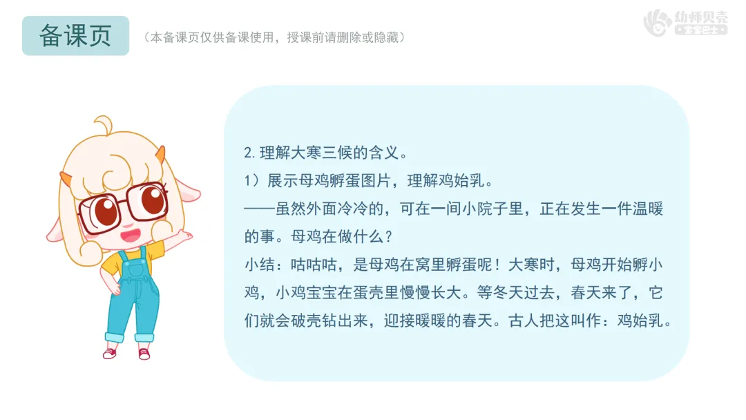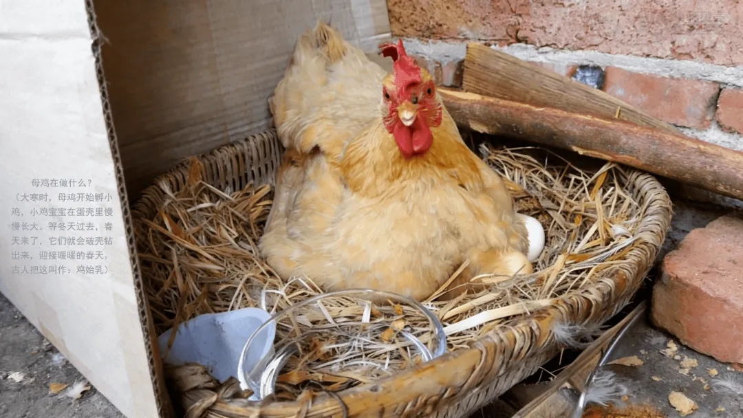 小结:咕咕咕,是母鸡在窝里孵蛋呢!大寒时,母鸡开始孵小鸡,小鸡宝宝在蛋壳里慢慢长大。等冬天过去,春天来了,它们就会破壳钻出来,迎接暖暖的春天。古人把这叫作:鸡始乳。