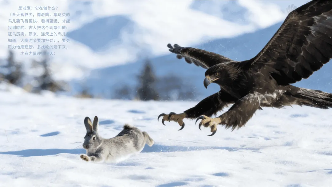 小结:冬天食物少,像老鹰、隼这类的鸟儿要飞得更快、看得更远,才能找到吃的。古人把这个现象叫做:征鸟厉疾。原来,连天上的鸟儿都知道,大寒时节要加把劲儿,要更用力地扇翅膀、多找吃的活下来,才有力量迎接春天。