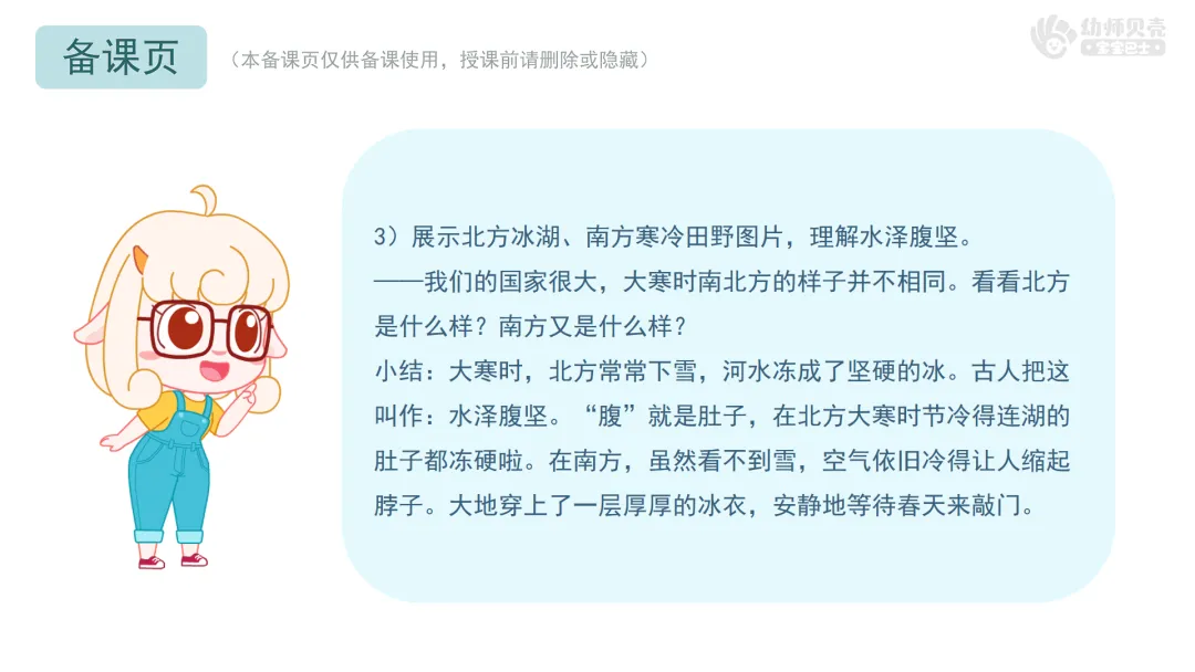 3)展示北方冰湖、南方寒冷田野图片,理解水泽腹坚。