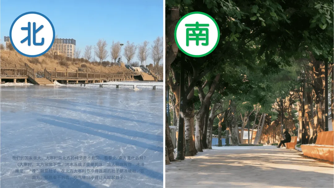 ——我们的国家很大,大寒时南北方的样子并不相同。看看北方是什么样?南方又是什么样?