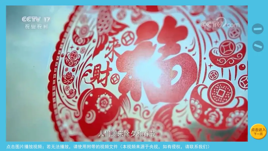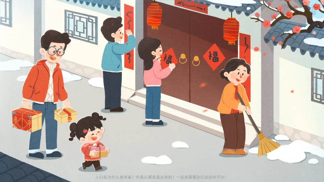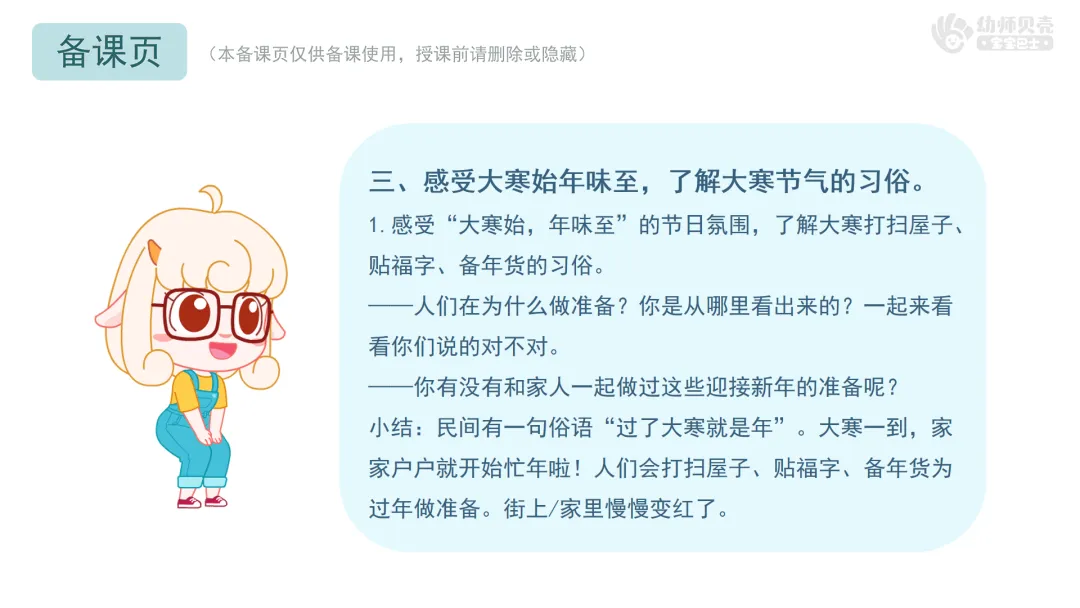 1.感受“大寒始,年味至”的节日氛围,了解大寒打扫屋子、贴福字、备年货的习俗。