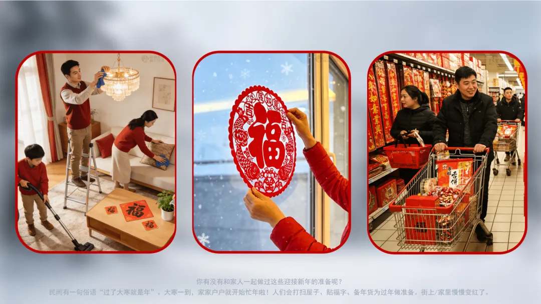 小结:民间有一句俗语“过了大寒就是年”。大寒一到,家家户户就开始忙年啦!人们会打扫屋子、贴福字、备年货为过年做准备。街上/家里慢慢变红了。