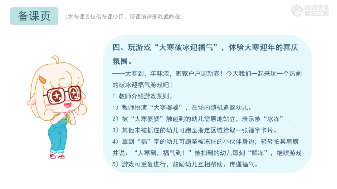 4)拿到“福”字的幼儿可跑至被冻住的小伙伴身边,轻轻拍其肩膀并说:“大寒到,福气到!”被拍到的幼儿即刻“解冻”,继续游戏。