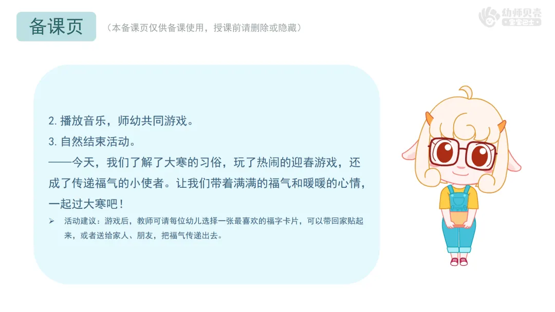 Ø活动建议:游戏后,教师可请每位幼儿选择一张最喜欢的福字卡片,可以带回家贴起来,或者送给家人、朋友,把福气传递出去。