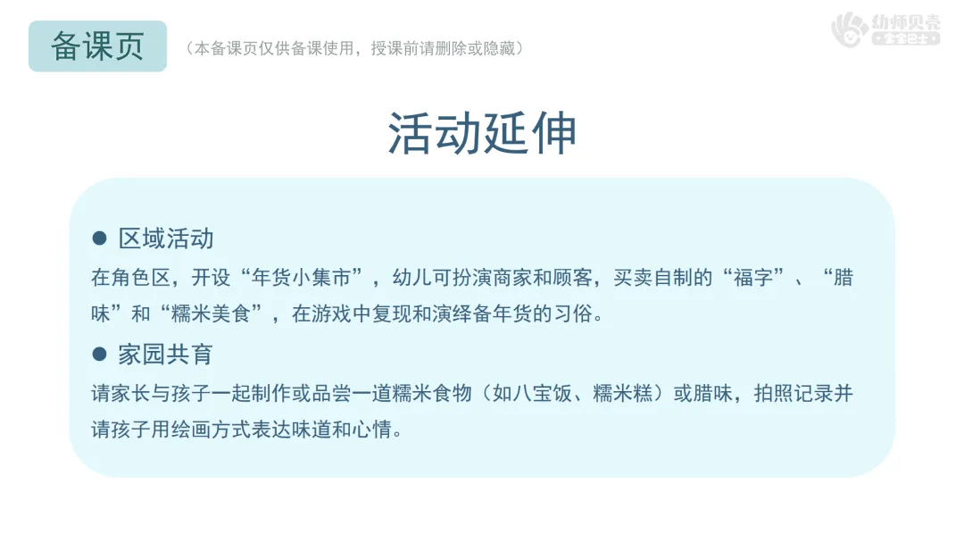 在角色区,开设“年货小集市”,幼儿可扮演商家和顾客,买卖自制的“福字”、“腊味”和“糯米美食”,在游戏中复现和演绎备年货的习俗。
