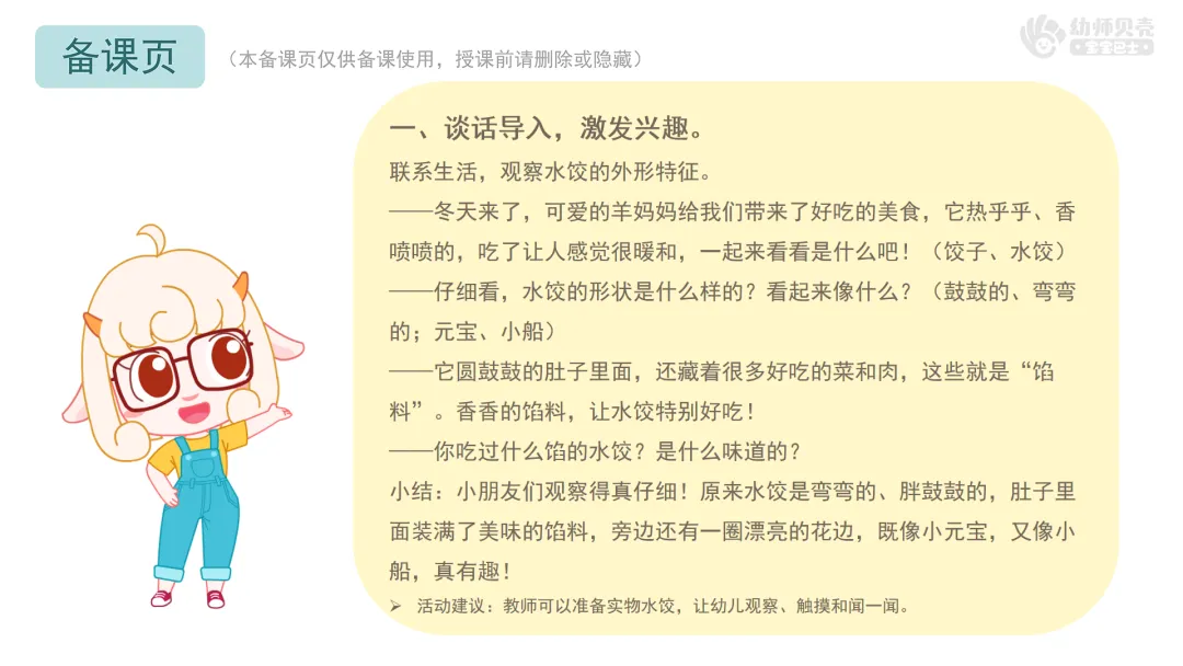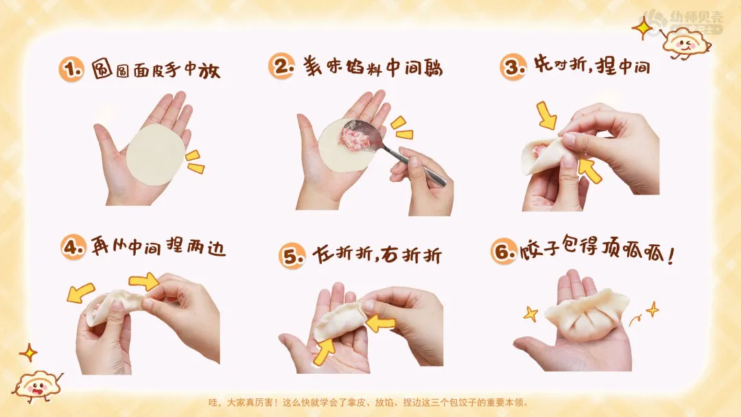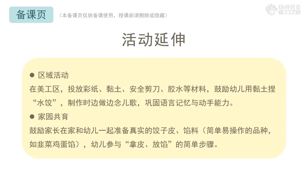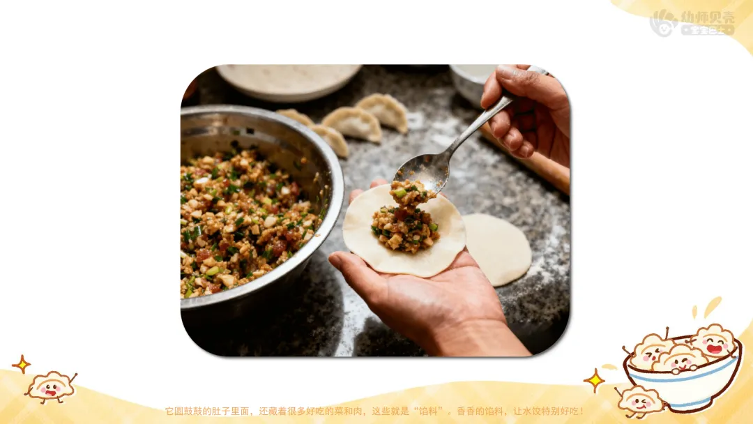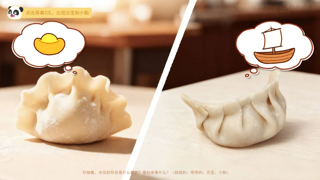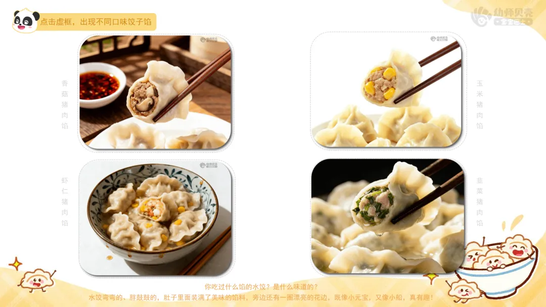 2.融入传统习俗,强化文化感知:活动前布置“寻找过年的水饺”家园任务,让家长带幼儿观察春节包水饺、吃水饺的场景;活动中增加“节日分享”环节,提问“过年时谁和你一起包水饺”“吃水饺时你心里感觉怎么样”,引导幼儿感知“水饺象征团圆”的文化内涵。可搭配播放春节包水饺的短视频,让文化渗透更生动具体。
