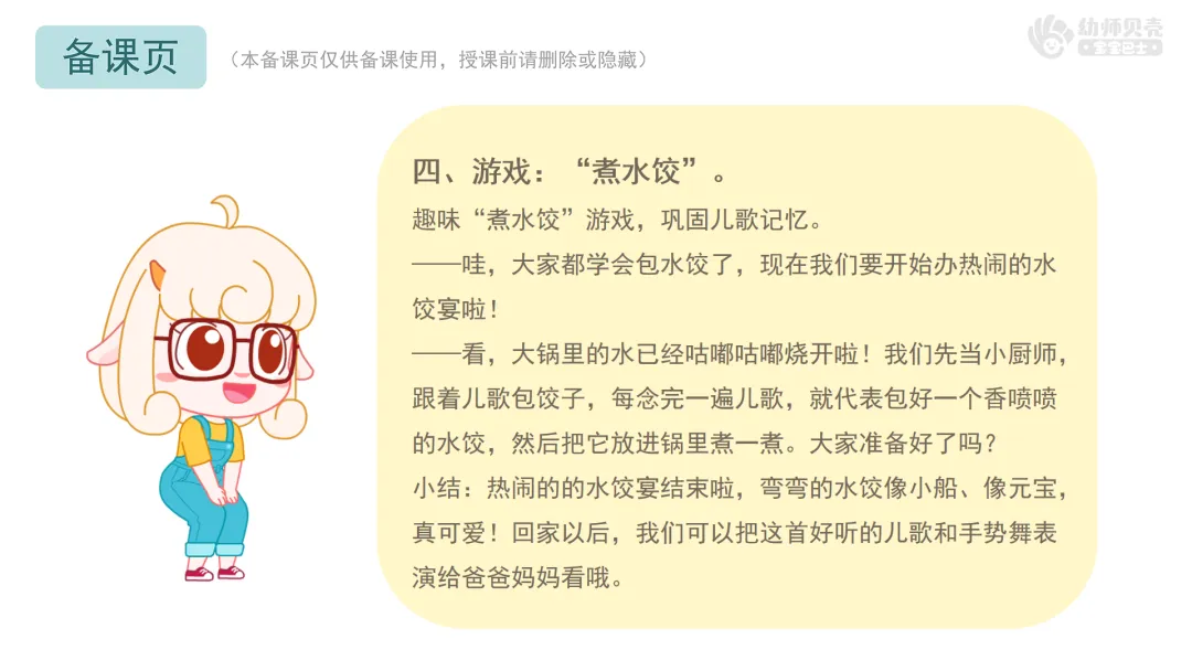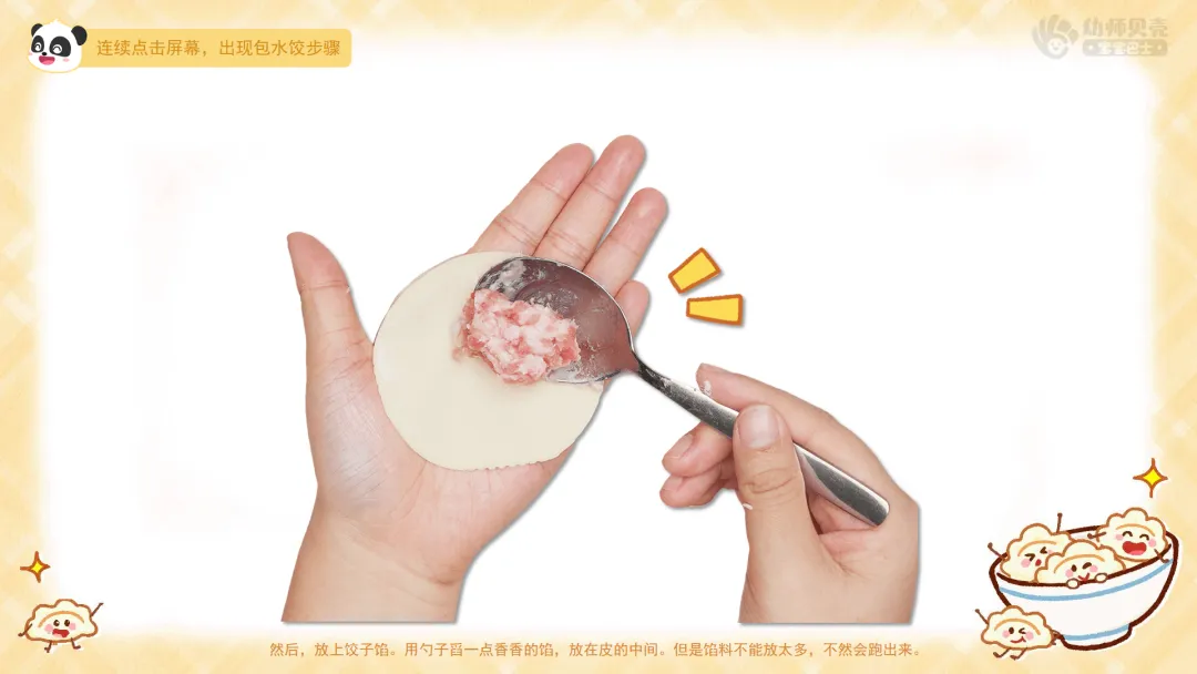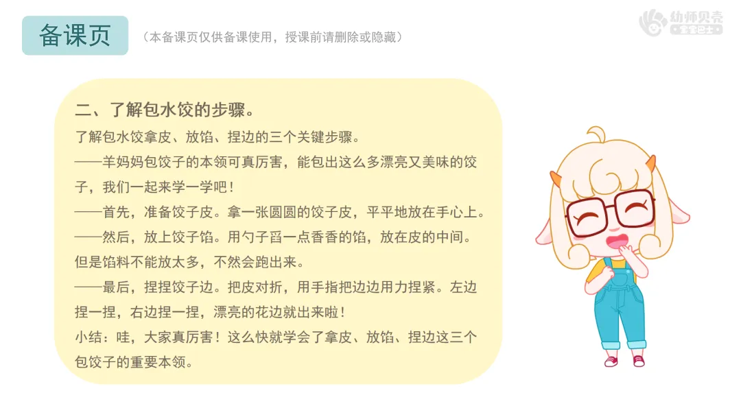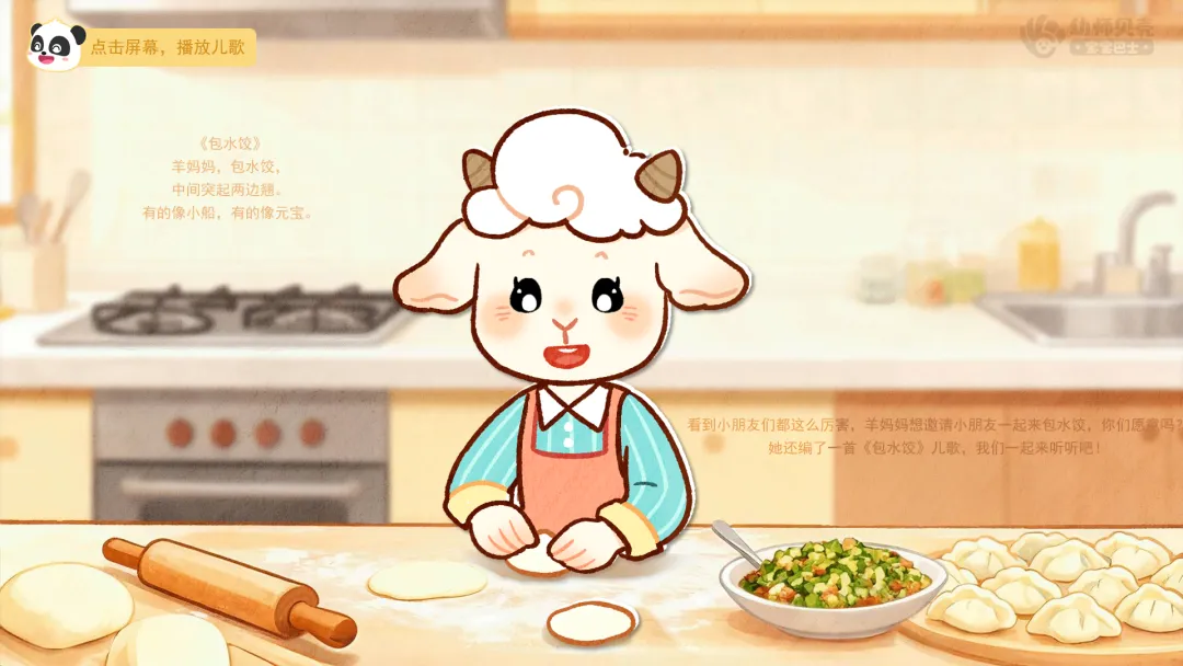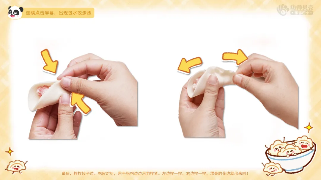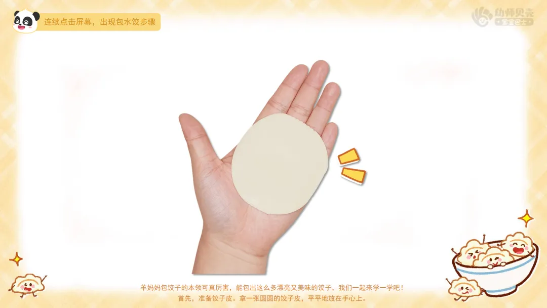 2.融入传统习俗,强化文化感知:活动前布置“寻找过年的水饺”家园任务,让家长带幼儿观察春节包水饺、吃水饺的场景;活动中增加“节日分享”环节,提问“过年时谁和你一起包水饺”“吃水饺时你心里感觉怎么样”,引导幼儿感知“水饺象征团圆”的文化内涵。可搭配播放春节包水饺的短视频,让文化渗透更生动具体。