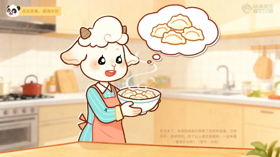 1.生活联结导入,激发主动参与:活动以“羊妈妈带来冬日美食”切入,通过提问“水饺像什么”“吃过什么馅的水饺”,快速联结幼儿的生活经验。教案中建议准备实物水饺让幼儿观察、触摸、闻味,进一步强化了直观感知,帮助幼儿轻松理解“弯弯的、胖鼓鼓”“馅料”等核心词汇,自然激发了幼儿对水饺的兴趣,为后续儿歌学习奠定了良好基础。