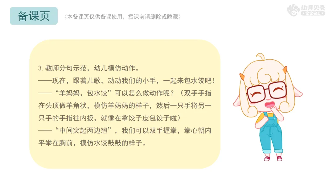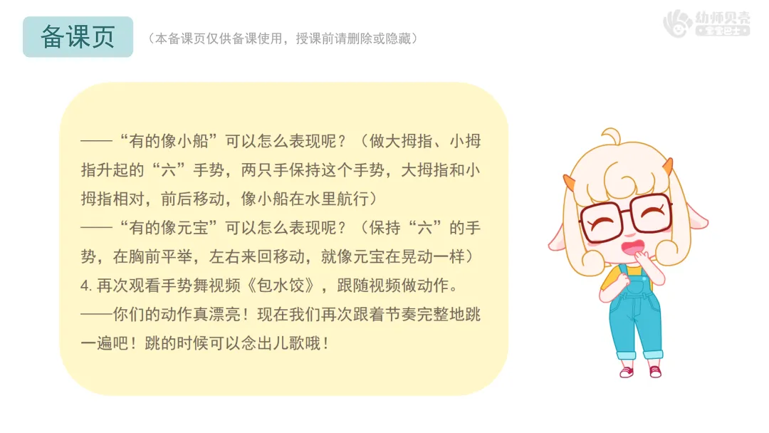 2.动静结合设计,契合年龄特点:活动将“学儿歌”与“手势舞”“煮水饺游戏”深度融合,打破了传统语言活动的静态模式。分句示范手势时,将儿歌内容转化为“做羊角”“握拳模仿水饺”“六手势扮小船/元宝”等简单易懂的动作,既降低了儿歌记忆难度,又满足了小班幼儿“好动、爱模仿”的天性;“煮水饺”游戏则通过“念儿歌包饺子—放水饺煮一煮”的趣味情境,让幼儿在快乐互动中巩固儿歌,实现了“玩中学、学中乐”。