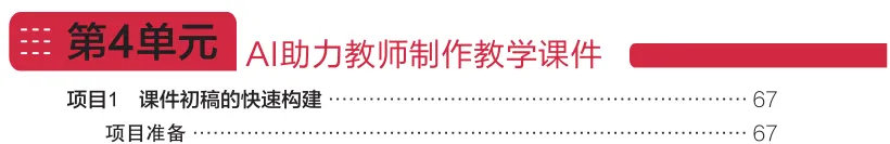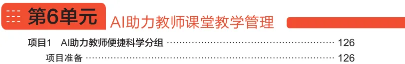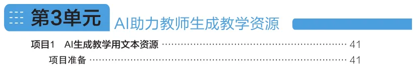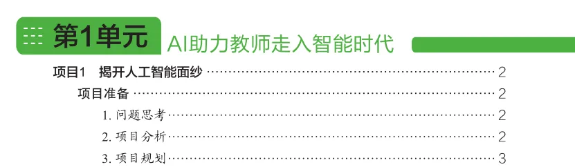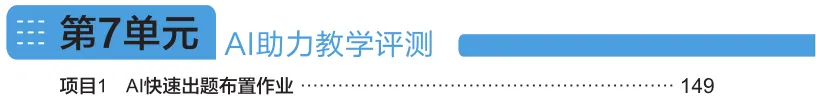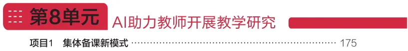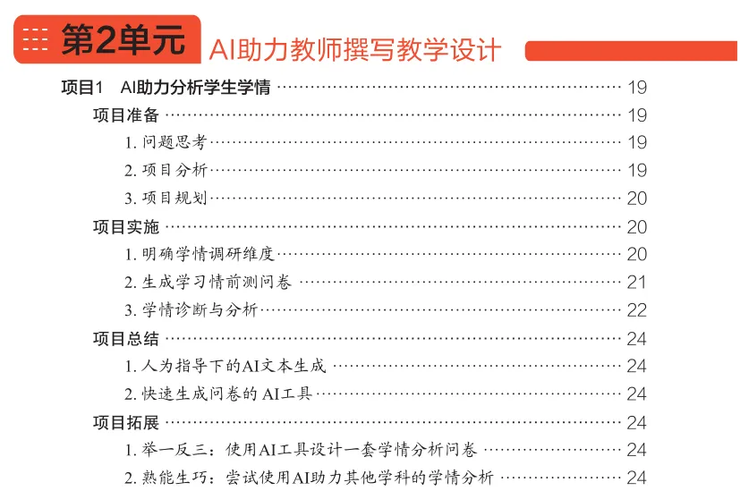 每个单元聚焦一个教学环节,按照 "项目情景→项目准备→项目实施→项目总结→项目拓展" 的闭环结构,详细拆解 AI 工具的具体应用方法,提供了清晰的操作步骤、实用的指令模板与真实的案例示范。