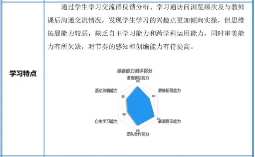 突出学生“最近发展区”,如“70%学生对实验操作流程不熟悉,需强化可视化演示”。