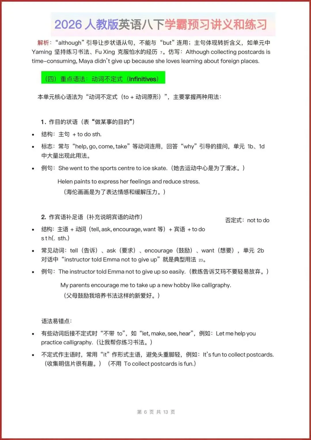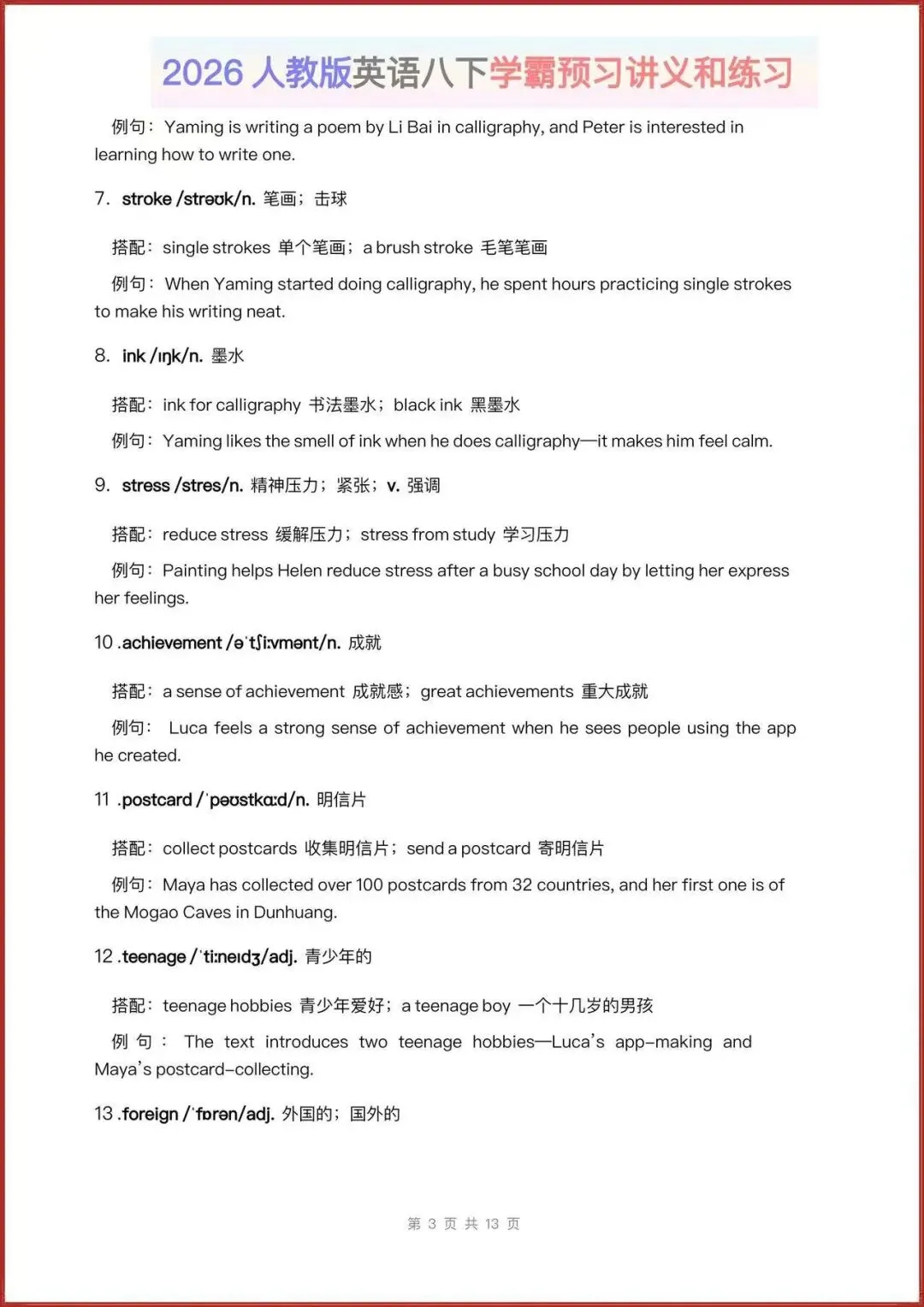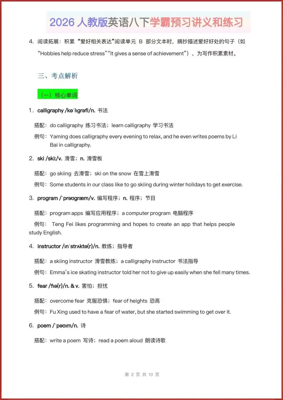 2026新人教版八年级下册英语学霸预习讲义和练习+U1-U3必背单元核心知识点,完整电子版可打印