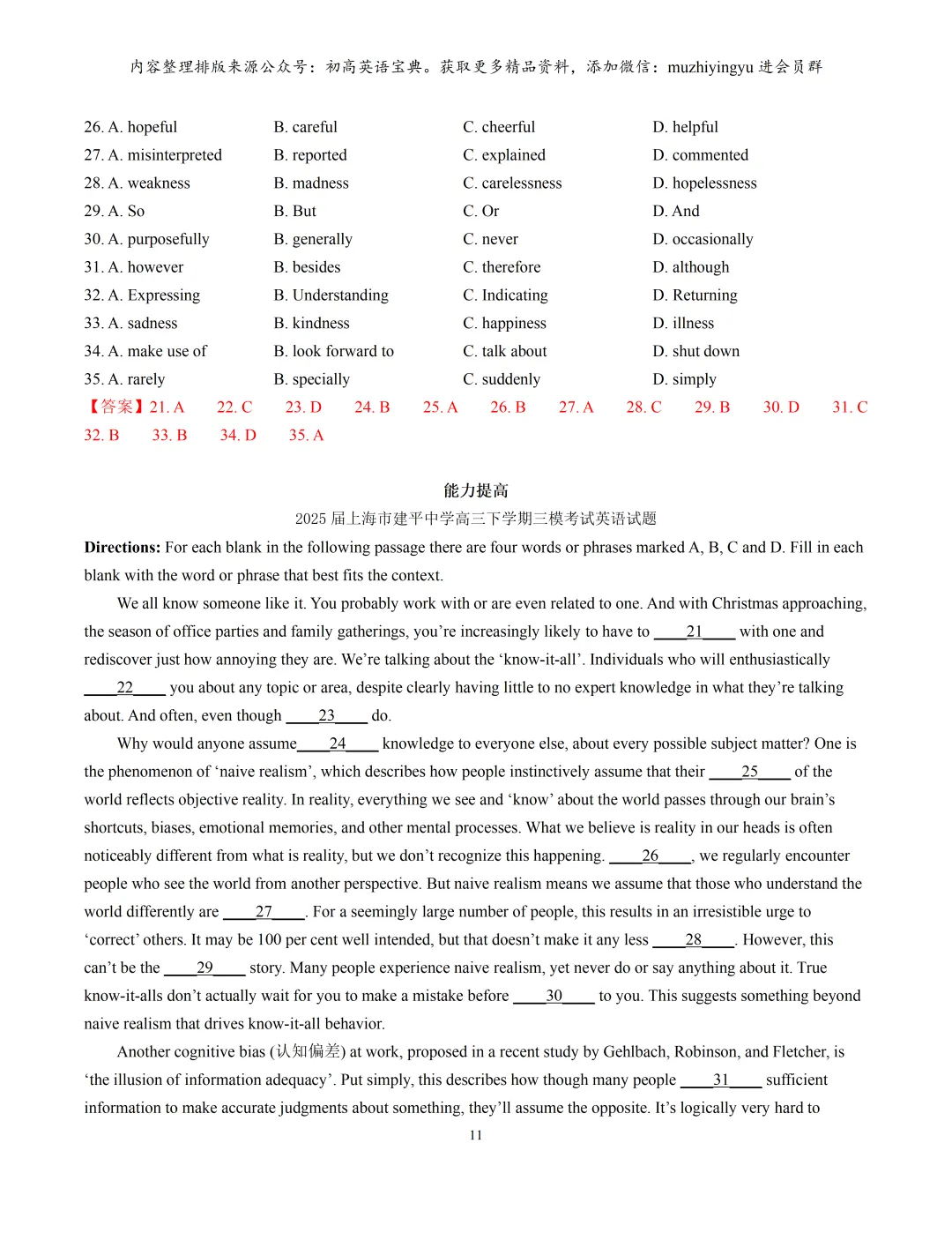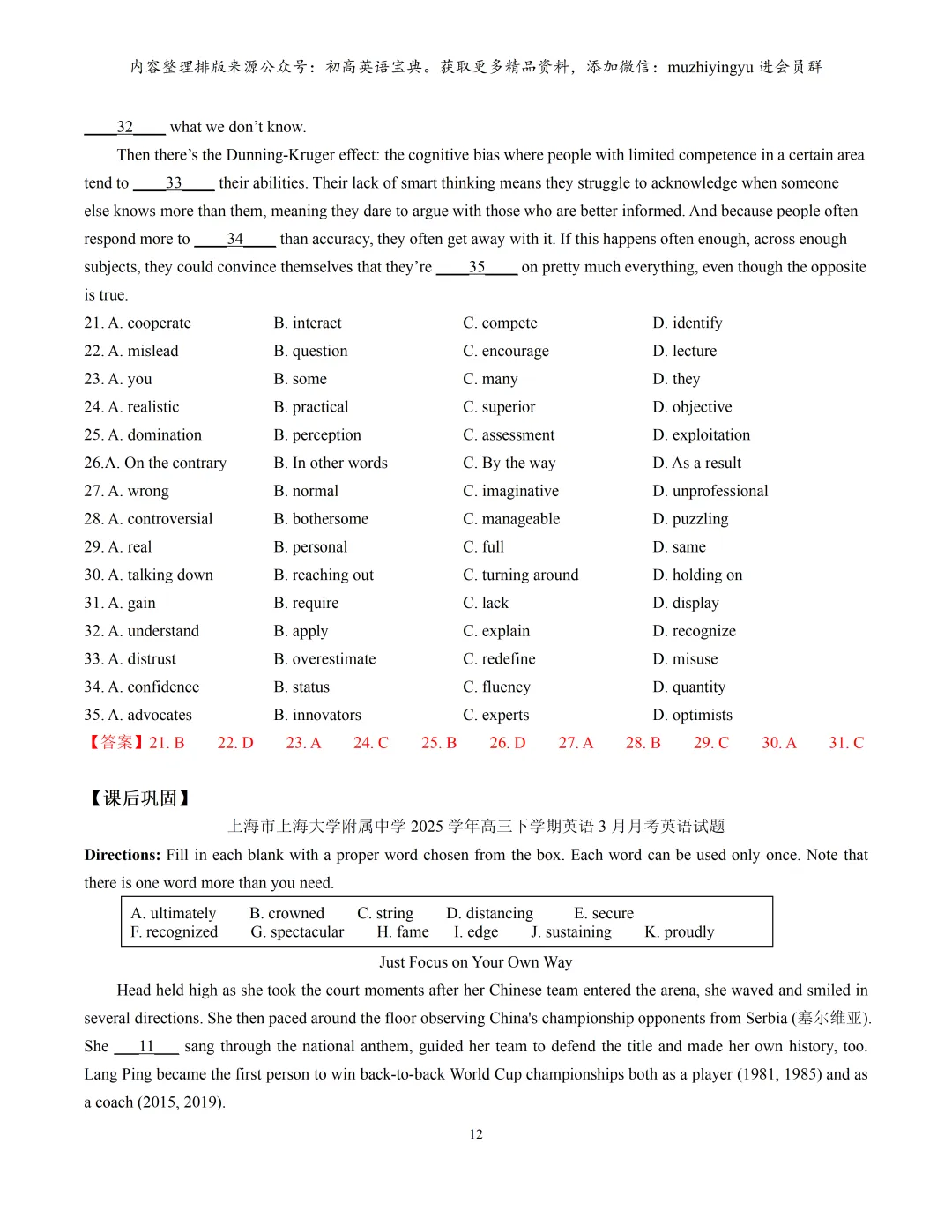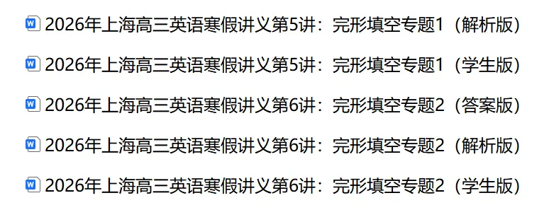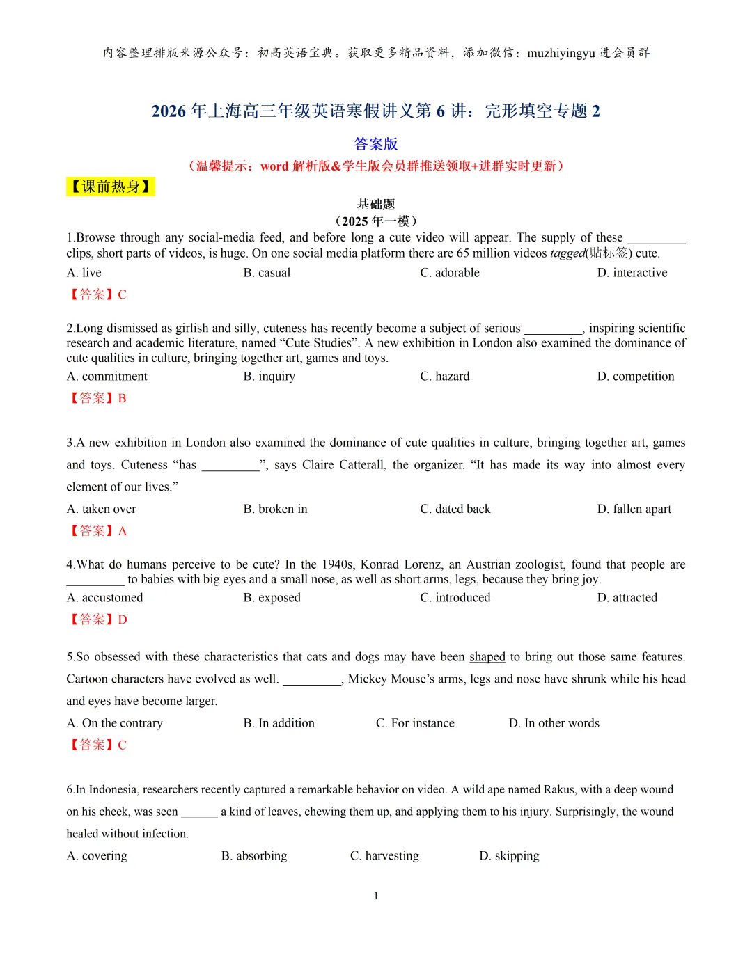 2026年上海高三英语寒假讲义第5&6讲:完形填空专题1-2