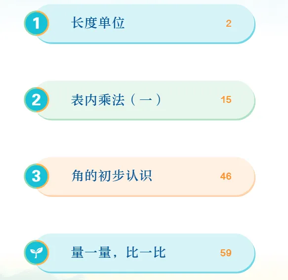 本册教材共7 个单元,涵盖 ** 长度单位、表内乘法(一)、角的初步认识、量一量比一比、表内乘法(二)、认识时间、表内除法(一)** 等核心内容。教材编排注重知识的循序渐进与生活联系,通过分物、测量、拼图等实践活动,降低抽象知识难度,符合聋生认知规律。其中,表内乘除法是全册重点,长度单位、角的认识、时间认读是难点内容。