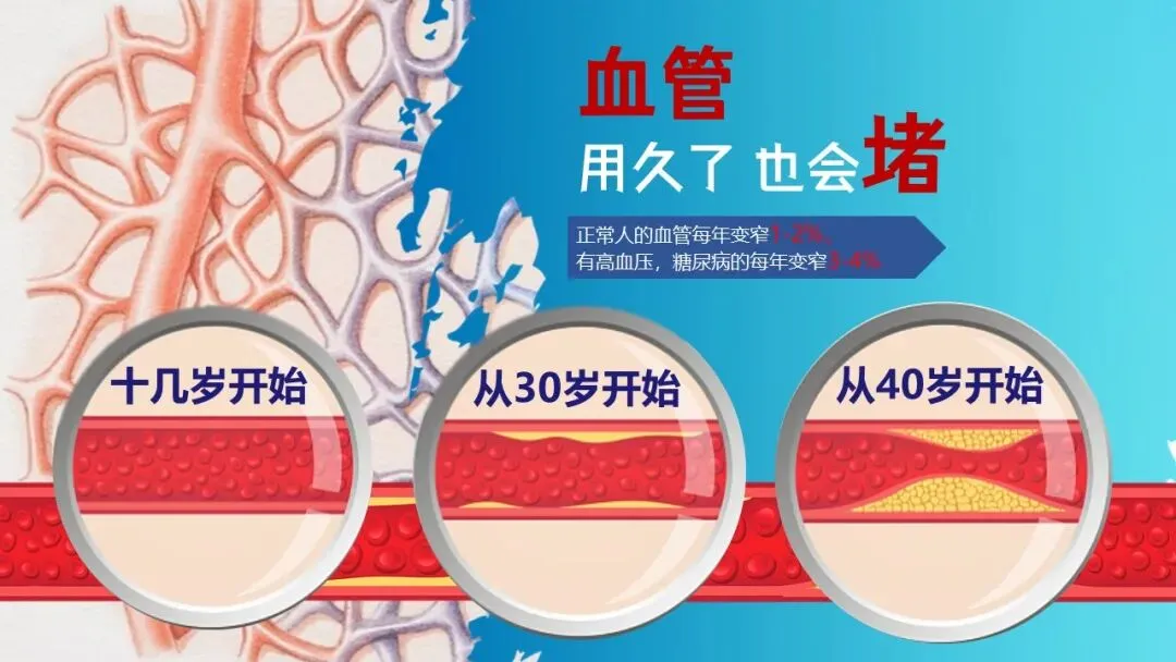据临床统计显示,最小的从十几岁开始就出现了血液粘稠,动脉粥样硬化的趋势。即使是正常人,随着年龄的增长,血管每年也会一点点的变窄。那如果有高血压,糖尿病的问题,血管变窄的速度会更快。意思是,即使是身体健康,饮食健康的人,血管也会慢慢的老化,这是很自然的事情。