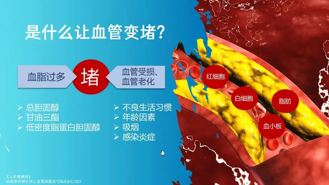血管中常住居民有这几个:红细胞、白细胞、血小板,和脂肪,也就是血脂,其中红细胞很勤奋,跑的也快,短短时间就可以跑遍全身。而脂肪是后进生,也很懒,跑的很慢,并且还总是喜欢找个坑就跳进去,不出来了。血管上怎么会有坑?这就是因为血管受损、老化,表面不再光滑,血脂钻到空子,就填进去了。慢慢的,就形成隆起的斑块,越积越多,血管就是这样堵上了。