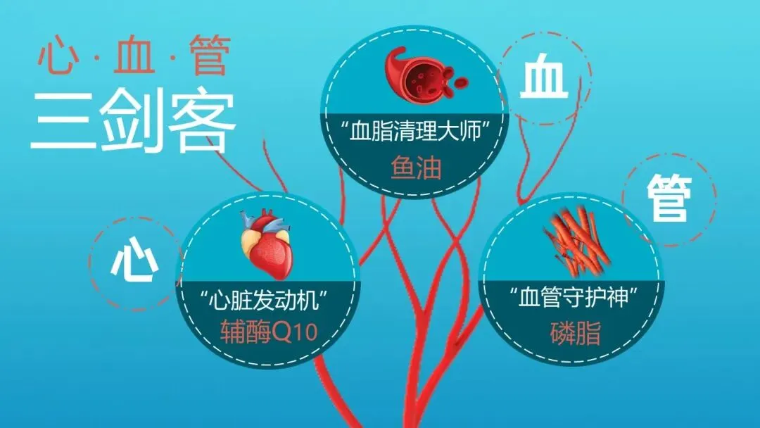 守护血管的三剑客,辅酶Q10、鱼油、磷脂,相互配合,各有侧重,为我们的血管健康保驾护航。