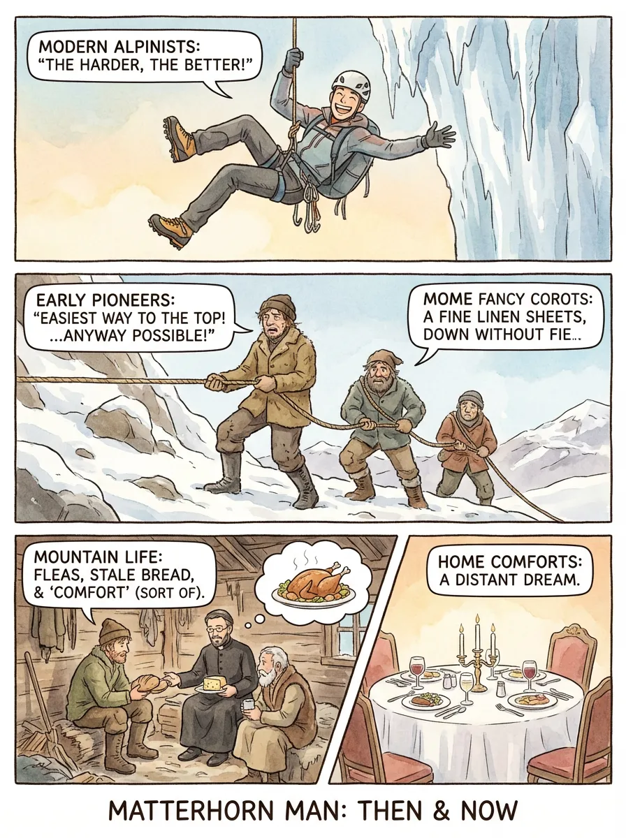 翻译:如今,我们很难体会到昔日登山先驱们的艰辛。