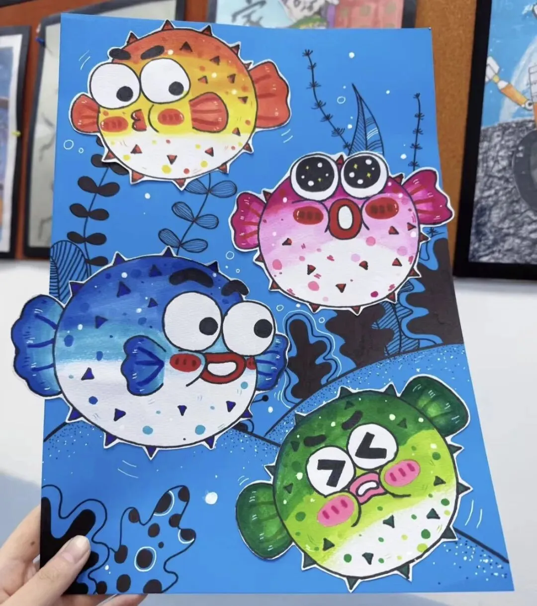 - 难点:通过色彩搭配与线条变化,展现刺豚“膨胀”与“收缩”的不同形态,融入个性化创意场景。