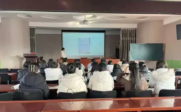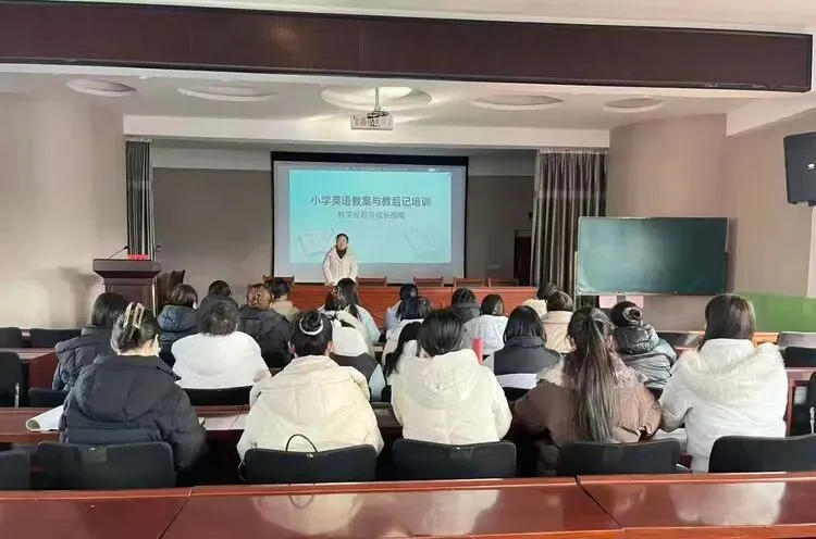 培训在四楼会议室进行,由全体英语老师参加。董老师通过PPT、现场展示等方式,系统讲解了教案撰写的关键要素,从教案设计的规范性到撰写技巧与格式,老师们认真聆听,不时记录重点内容,积极思考如何将理论应用于实际教学。