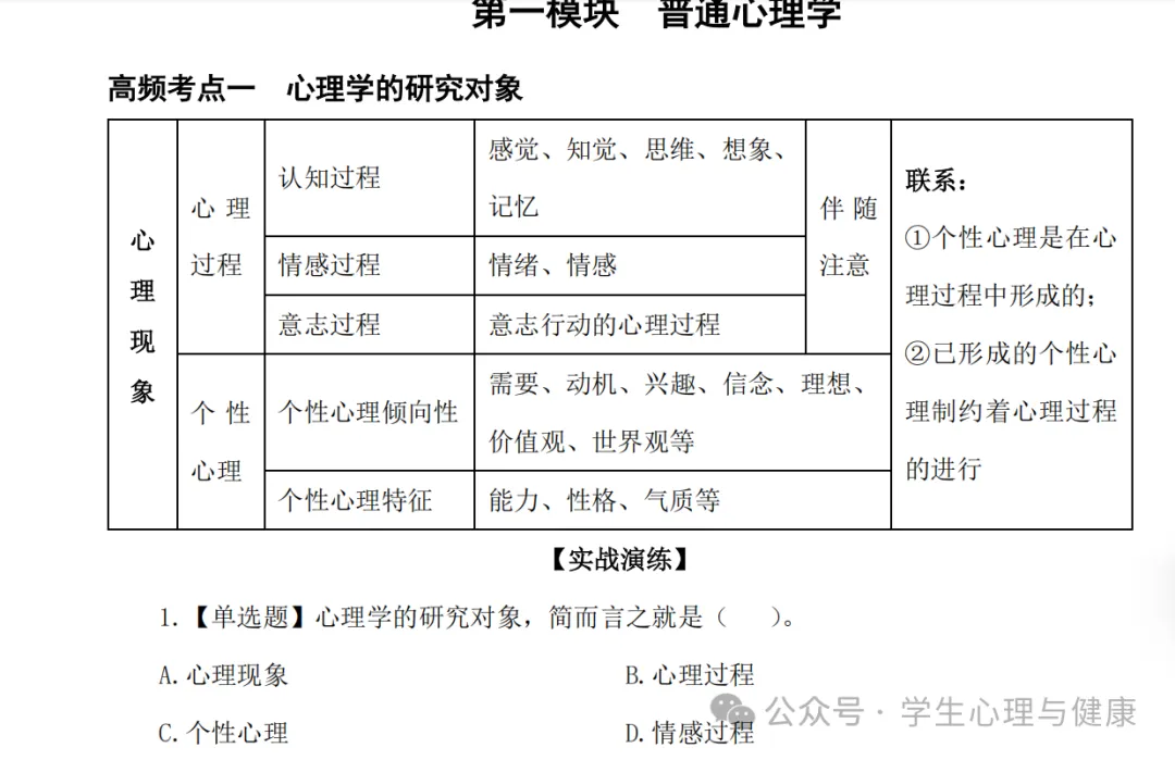 在内容上与基础班基本一致,不过内容更加丰富,讲解更加细致,同时难度有一定提升,同时增加了实践部分:教学实践,这一块对后期面试或者万一笔试中涉及心理健康课教学设计是十分有益的。教学设计往往分值较大,一般笔试中不大涉及,但建议大家在笔试时准备一下,有备无患。