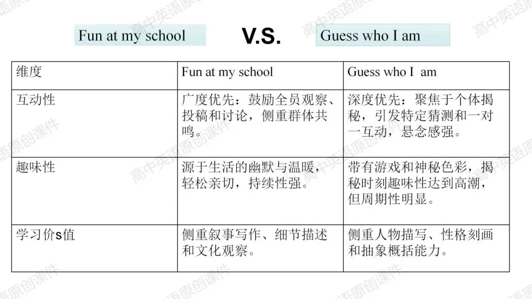 学生可以从互动性、趣味性和学习价值这三个维度来思考两个栏目的优势在哪里。
