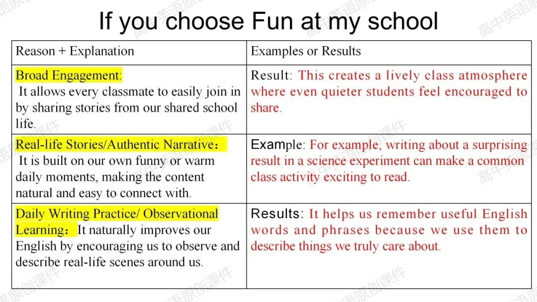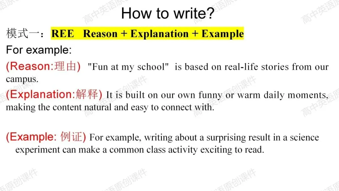 根据REE和RER的模式,可以引导学生根据不同的原因,思考拓展细节和内容,笔者认为这个步骤是非常重要的,培养学生的逻辑思维能力,内容到位了,接下来就是词汇和句法的训练。