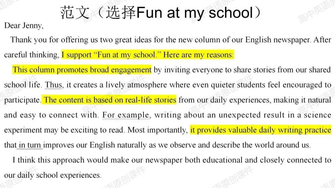 最重要的是审题,标黄为题目关键词,这里要注意是Jenny给李华提出了两个选项,然后李华来选,而不是李华给Jenny提建议,所以要搞清楚立场。