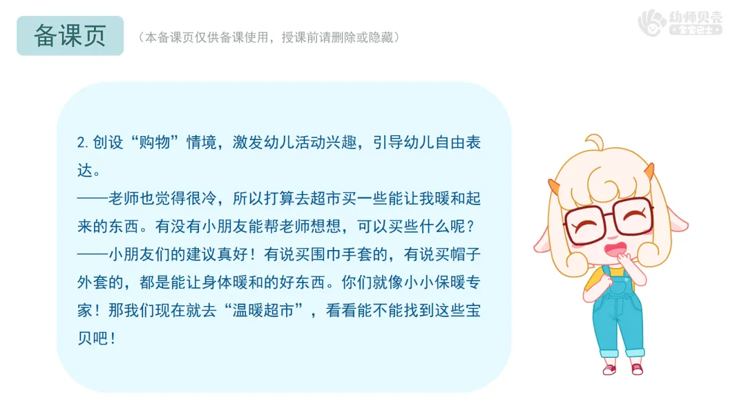 ——老师也觉得很冷,所以打算去超市买一些能让我暖和起来的东西。有没有小朋友能帮老师想想,可以买些什么呢?