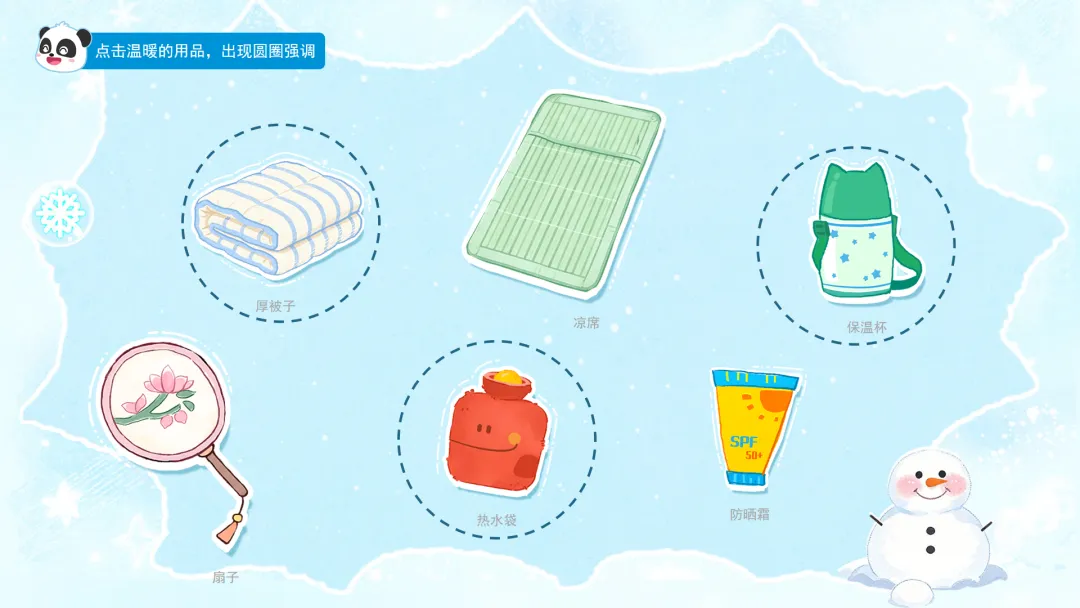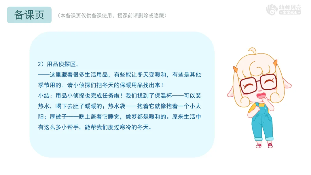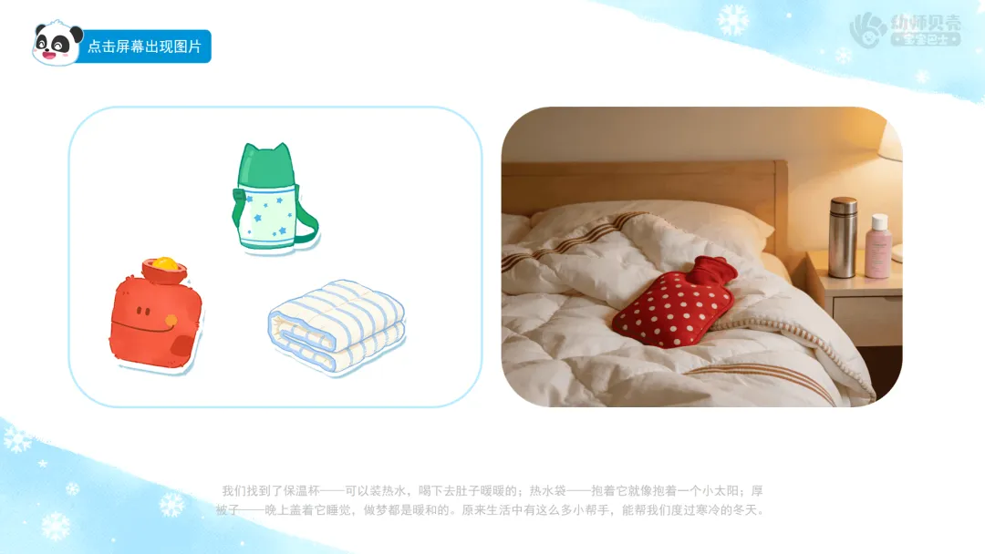 小结:用品小侦探也完成任务啦!我们找到了保温杯——可以装热水,喝下去肚子暖暖的;热水袋——抱着它就像抱着一个小太阳;厚被子——晚上盖着它睡觉,做梦都是暖和的。原来生活中有这么多小帮手,能帮我们度过寒冷的冬天。
