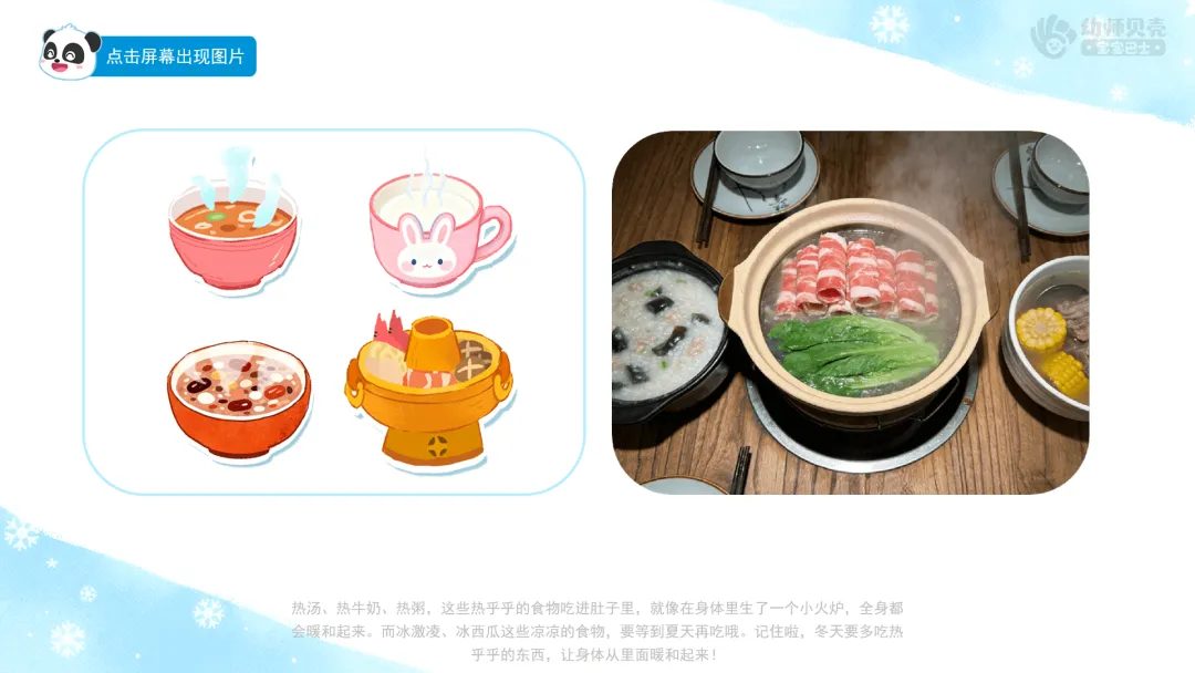 小结:小朋友们都是美食小专家!都选对了——热汤、热牛奶、热粥,这些热乎乎的食物吃进肚子里,就像在身体里生了一个小火炉,全身都会暖和起来。而冰激凌、冰西瓜这些凉凉的食物,要等到夏天再吃哦。记住啦,冬天要多吃热乎乎的东西,让身体从里面暖和起来!