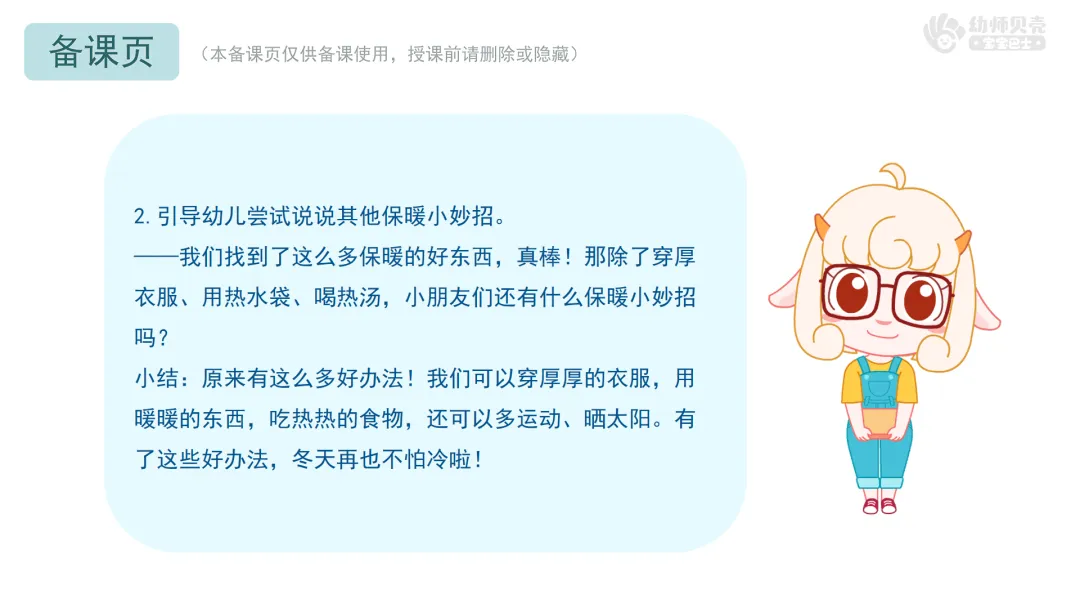 小结:今天我们当了小小保暖专家,找到了很多冬天保暖的好方法,还学会了照顾自己和关
