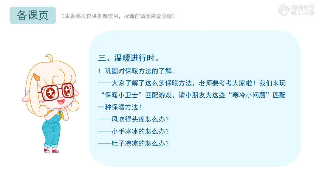1.玩匹配游戏,巩固对保暖方法的了解。