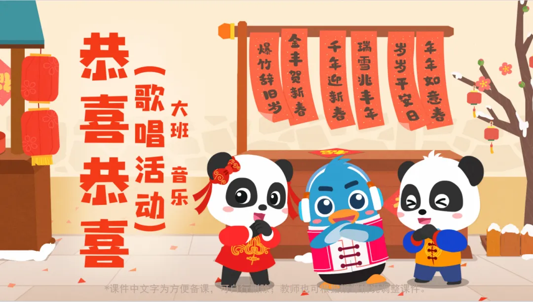 从拜年情景出发,学唱经典贺年歌曲《恭喜恭喜》。课件配有互动游戏“恭喜恭喜好朋友”,让孩子在音乐与动作中传递祝福,增强社交情感,教室秒变欢乐新年派对现场!