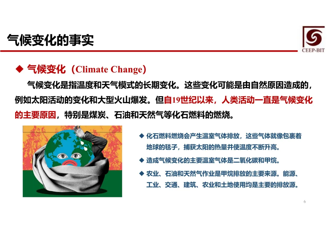 《碳减排管理:政策、路径与区域实践报告》由北京理工大学能源与环境政策研究中心(CEEP-BIT)发布,系统梳理了碳减排管理的理论基础、政策工具及实践案例,为全球气候治理提供了多维度参考。课件指出,工业革命以来人类活动导致的温室气体排放是气候变化的主因,其中化石燃料燃烧、土地利用变化等因素加剧了大气中二氧化碳浓度的上升,而碳减排管理需通过政策调控、技术创新和国际合作实现“双碳”目标。